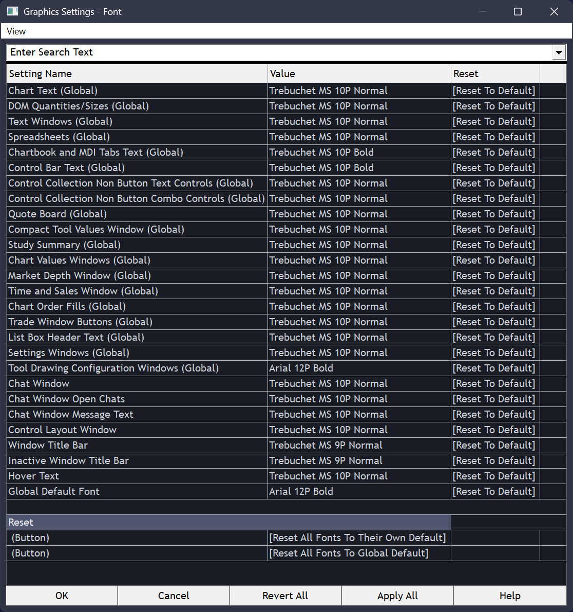 To reset everything, you do not need to reinstall Sierra Chart. Refer to the following for how to reset everything: Resetting Sierra Chart to a Default State / Restoring Backup Global Configuration File: Resetting Sierra Chart to a Default State The "Sierra4.config" file, in particular, resets the settings including the graphics settings. The one thing you will have to do after doing this is re-input your service settings in the "Data/Trade Service Settings", but everything else will be back to a "default" state. We want to point out that the reason that option is present for the colors is that there has always been an option to reset the color to the default, so that it carried over from the original window layout to the new layout. We have noted the request to have a "Reset to Default" option for other settings. We can not say when we get to any particular request. For the most reliable, advanced, and zero cost futures order routing, use the Teton service: Sierra Chart Teton Futures Order Routing |