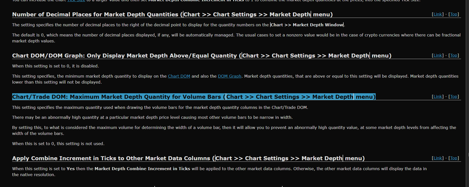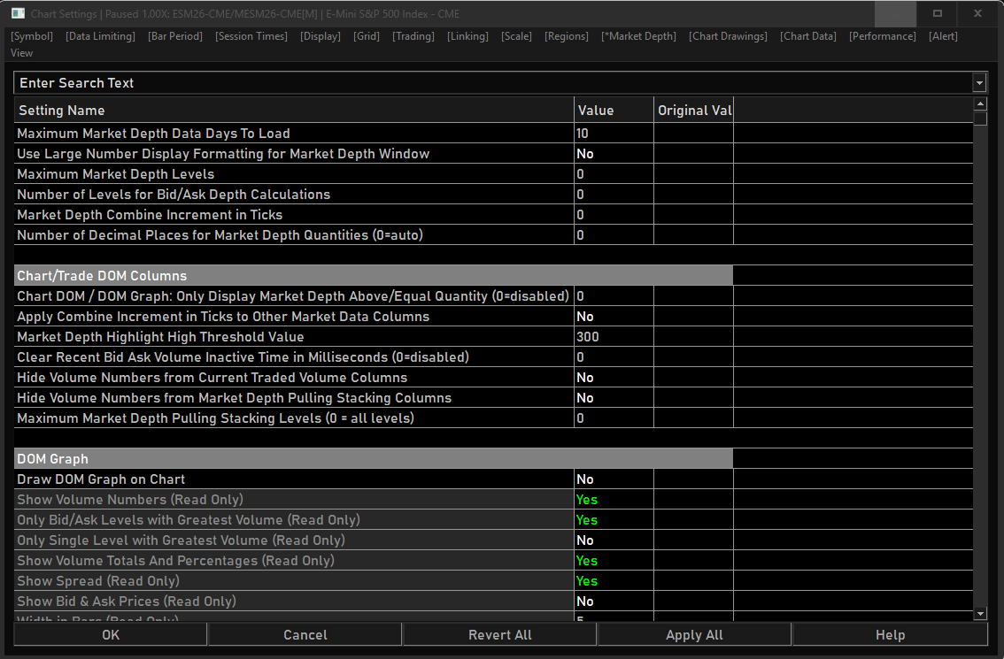 Hello, I'm currently configuring my DOM, but when I looked for this setting (Chart/Trade DOM: Maximum Market Depth Quantity for Volume Bars), which is listed in the documentation, I realized I couldn't find it in my chart settings (see photo). Thank you for your help, and have a great day.