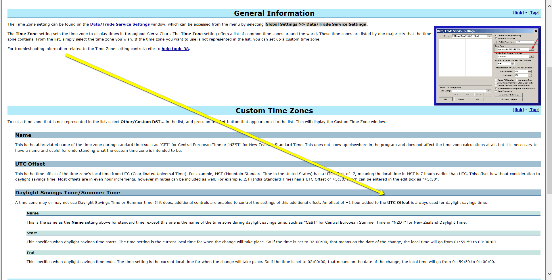 Hi I am in the UK so my charts show my local time but I want to chart US Futures. How can I set Sierra Chart to automatically take account of Daylight Savings time? For example, the Chicago Pit usually opens at 14:30 UK time but due to daylight savings now opens at 13:30 UK time. I have a chart which I only want to show the Pit hours so I set this to start at 14:30 but now it is missing the first hour of Pit trading since the clocks changed. Is this the correct way to chart only the pit session? I do not want to change the start time to 13:30 since all previous sessions will have the wrong start time. In Data/Trade Service Settings I have Time Zone set to "London (+0 GMT/+1 BST)" How can I fix this? I just want to know the correct way to automatically adjust Daylight Savings time to show the Pit Session. Date Time Of Last Edit: 2014-10-28 14:46:00