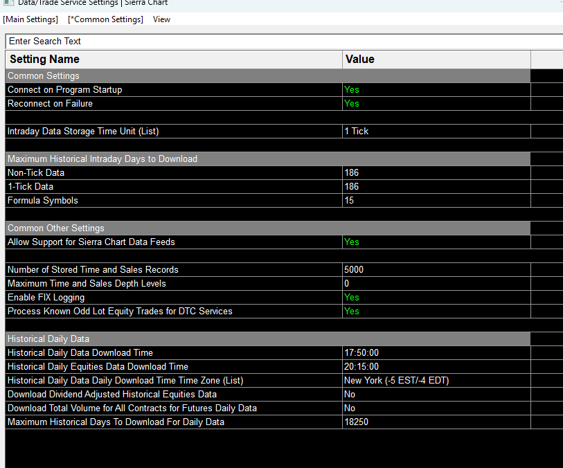 I am trying to load a daily(historical) chart for NQ to see data going back 20+ years. I currently use Rithmic Direct - DTC as the "Current Selected Service" under Data/Trade Service Settings. It is my understanding that I can still use Denali historical data with Rithmic as my trade service as long as 1. Market Data Username and Password are blank 2. Data/Trade Service Settings>Common Settings> Common Other Settings>Allow Support for Sierra Chart Data Feeds is set to "YES". When I load a daily chart for NQ with these settings, I can only see data back to 2020. Im assuming that this is because data is being pulled from Rithmic instead of Denali. When I change "Current Selected Service" to "SC Data" I can then see data on my daily chart all the way to the year 2000 and beyond. I have my chart settings>Data Limiting - Number of Days to Load set to 5250, and Symbol>Continuous Contract set to Continuous Futures Contract - Volume Based Rollover. I know other users have been able to successfully use this setup, but I cant figure it out. Appreciate any help you can provide. |