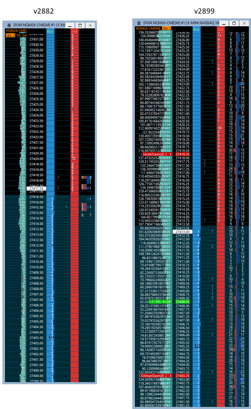 Dear Support After updating from v2882 to v2899 I am having problems with my DOM charts. V2899 has the same Sierra4.config and I've copied the exact .cht and variations from v2882 all with the same issue and decimals over the histogram etc. Please can you provide guidance. Many thanks. Date Time Of Last Edit: 2026-04-27 08:37:04