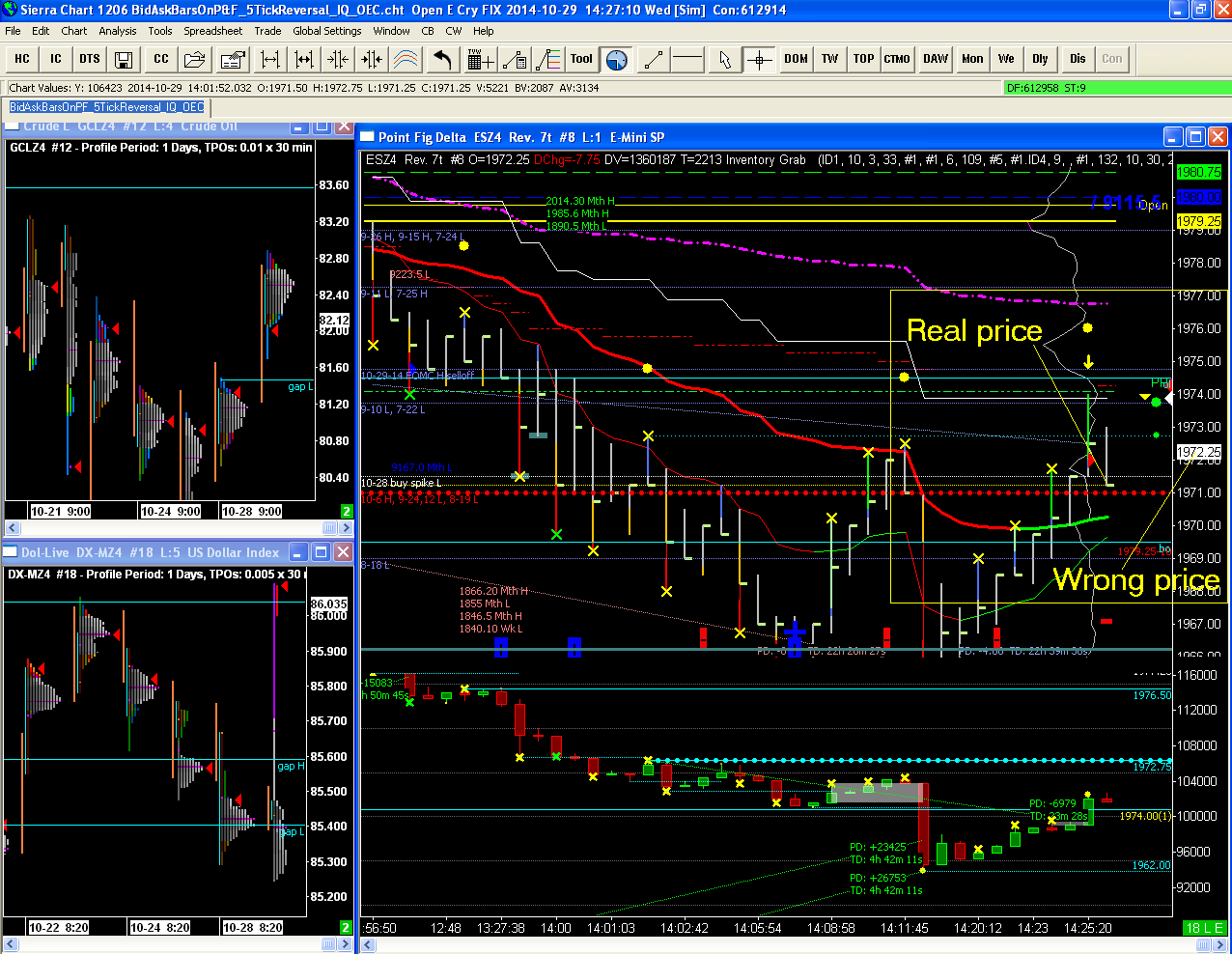 We saw evidence on our server of the same OEC data feed problem : Last trade price is higher than 10 ticks above Ask. ESZ4 | 2014-10-29 14:17:08 Last trade price is higher than 10 ticks above Ask. RLM-MZ4 | 2014-10-29 14:17:08 Last trade price is higher than 10 ticks above Ask. EMDZ4 | 2014-10-29 14:17:08 Last trade price is higher than 10 ticks above Ask. ESZ4 | 2014-10-29 14:17:08 Last trade price is higher than 10 ticks above Ask. FDAXZ4 | 2014-10-29 14:17:09 Last trade price is higher than 10 ticks above Ask. RLM-MZ4 | 2014-10-29 14:17:09 Last trade price is higher than 10 ticks above Ask. NQZ4 | 2014-10-29 14:17:09 Last trade price is higher than 10 ticks above Ask. ESZ4 | 2014-10-29 14:17:09 Last trade price is higher than 10 ticks above Ask. GCLZ4 | 2014-10-29 14:17:09 Last trade price is higher than 10 ticks above Ask. RLM-MZ4 | 2014-10-29 14:17:09 Last trade price is higher than 10 ticks above Ask. ESZ4 | 2014-10-29 14:17:09 Last trade price is higher than 10 ticks above Ask. NQZ4 | 2014-10-29 14:17:09 The timestamps at the end are in US Eastern time. This problem occurred before and after this time. Sierra Chart Support - Engineering Level Your definitive source for support. Other responses are from users. Try to keep your questions brief and to the point. Be aware of support policy: https://www.sierrachart.com/index.php?l=PostingInformation.php#GeneralInformation For the most reliable, advanced, and zero cost futures order routing, *change* to the Teton service: Sierra Chart Teton Futures Order Routing Date Time Of Last Edit: 2014-10-29 20:36:08