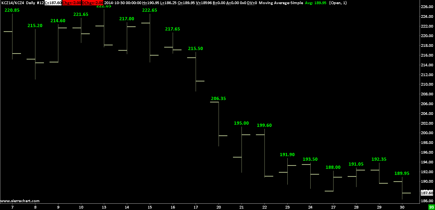 The reason why I am asking is because my platform I use "Go-futures" is telling me a different price for KCZ14 then Sierra chart is. Sierra chart is telling me 188 Go futures telling me 188.45 The one thing I am unsure about is if (KCEZ14) from sierra chart is the same as (KC.Z14) from Go-futures |