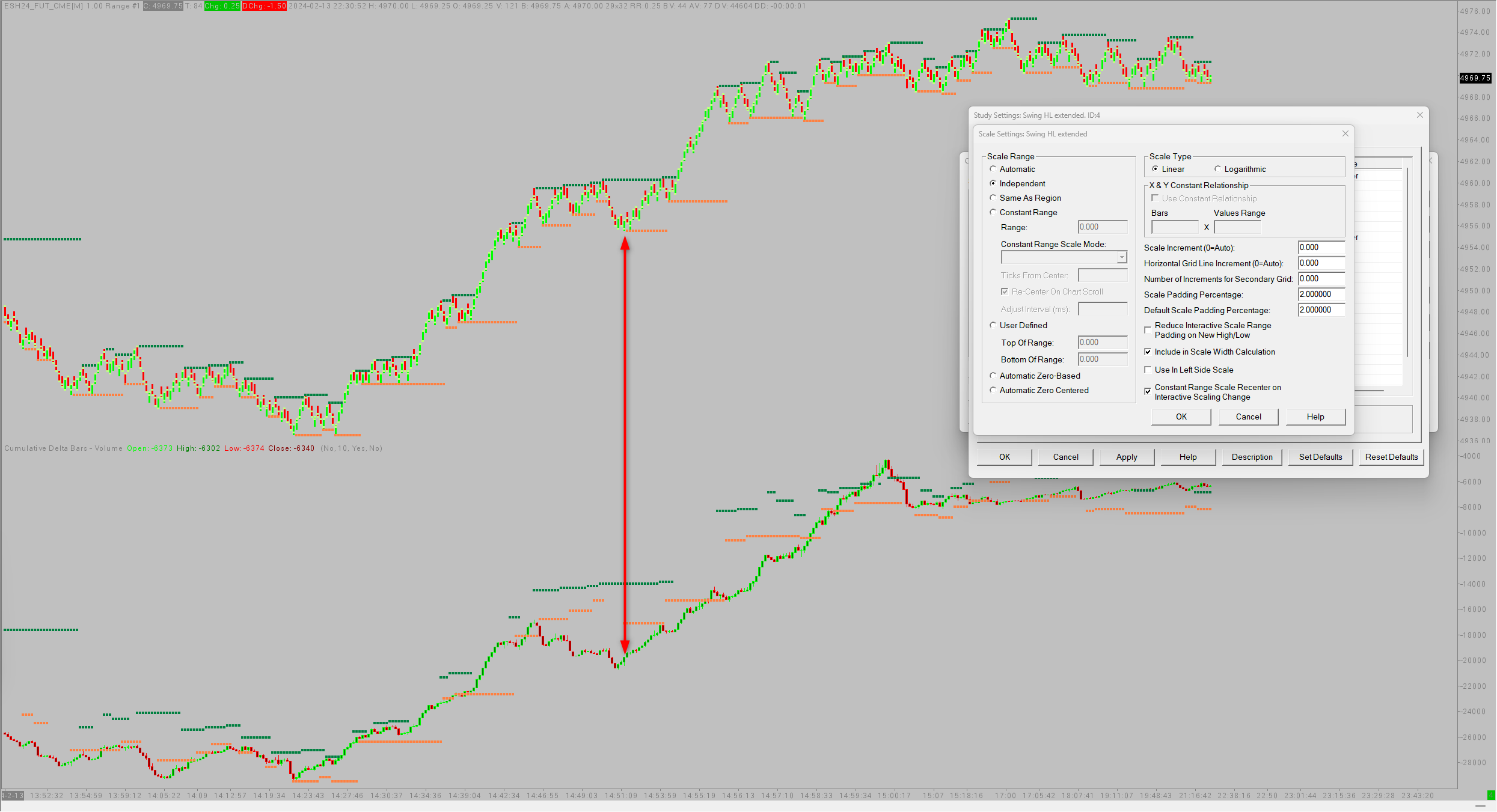 @Sawtooth - Would it be possible with this spreadsheet study to plot the Swing HL extended on the corresponding Cumulative delta candle? I'm attaching a screenshot for reference. Reason for... it would make it a easier to see hidden divergence.