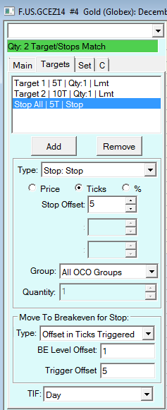 Hello I am trying to accomplish the following strategy and just want to make sure my settings are correct. I would like to have a 2 target offset with 1 stop order for both contracts with a breakeven + 1 tick strategy. 1st Target - 5 ticks 2nd Target - 10 ticks Stop for all - 5 ticks When the first target is hit I would like my stop to move to breakeven plus 1 tick to cover commissions for the trade. Can you confirm if the following settings per screenshot will achieve the following? http://puu.sh/cERQl/84924c5a52.png |