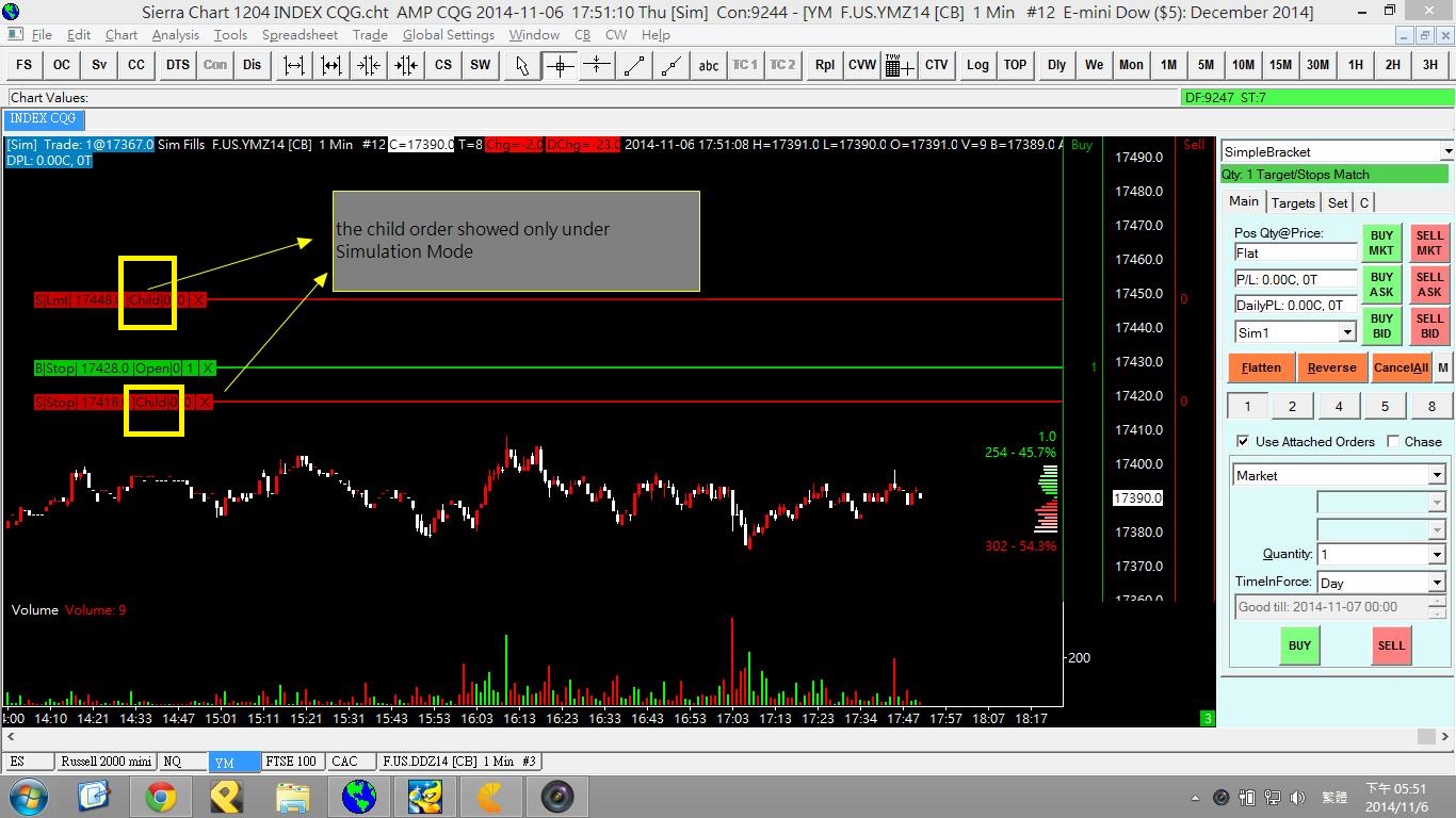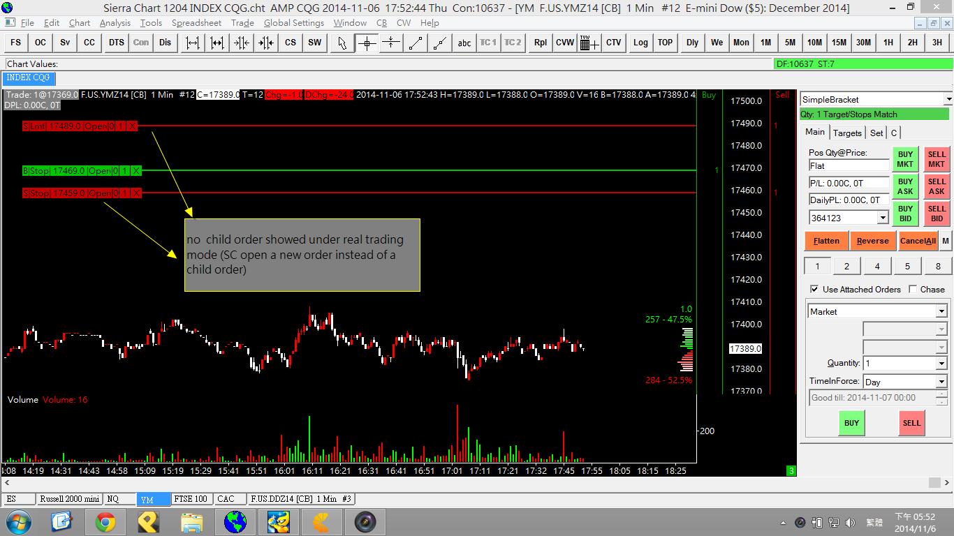 data feed: CQG issue 1: no child order showed under real trading mode (SC open a new order instead of a child order), the child order showed only under Simulation Mode, pls refer to the attached, thx. issue 2: SC version: can't connect to broker(Amp) under pre release version , so I install 1205 at first then change to 1204, but the child order doesn't show under real trading mode (1204 &1205) . Log: Software version: 1204 | 2014-11-06 17:38:09 Enabled for: Advanced Features. | 2014-11-06 17:38:09 Enabled for: Sierra Chart Historical Data Service. | 2014-11-06 17:38:09 Allow Support for Sierra Chart Data Feeds is enabled. | 2014-11-06 17:38:09 Active service: AMP CQG | 2014-11-06 17:38:09 Data/Trade Service Settings automatically set. | 2014-11-06 17:38:09 Time Zone: +08:00:00 (HKT+08) | 2014-11-06 17:38:09 2014-11-06 17:38:09 Local computer clock time | 2014-11-06 17:38:09 2014-11-06 09:38:09 GMT time | 2014-11-06 17:38:09 2014-11-06 17:38:09 Time zone adjusted time | 2014-11-06 17:38:09 Time difference to server time: 0 seconds. | 2014-11-06 17:38:09 Program path: C:\SierraChart\ | 2014-11-06 17:38:09 Data Files path: C:\SierraChart\Data\ | 2014-11-06 17:38:09 OS Version Number: 6.2 | 2014-11-06 17:38:09 Locale Information: C | 2014-11-06 17:38:09 Date Time Of Last Edit: 2014-11-06 18:41:49
