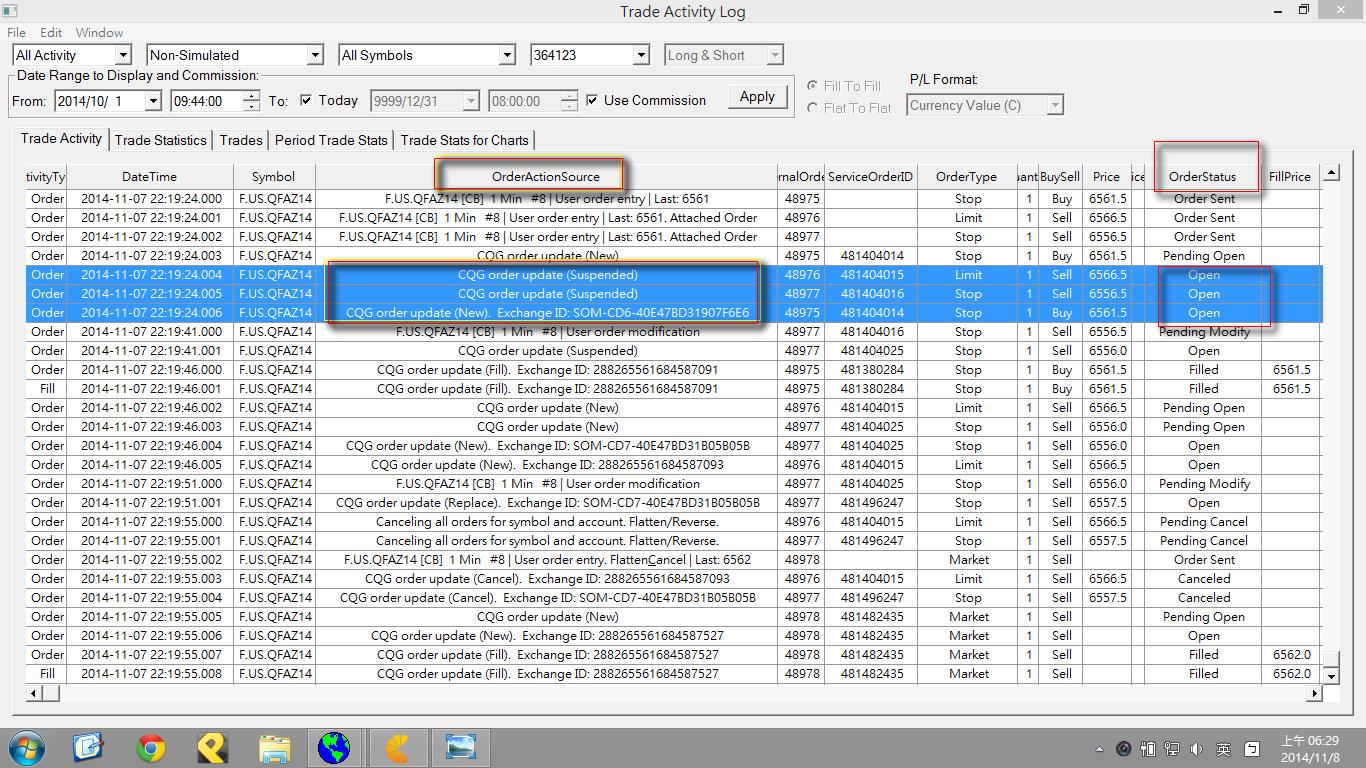 The problem with bracket orders is from the "Order status" and "OrderActionSource" in the Trade Activity Log. Previously when using bracket orders, the child order will be opened after the parent order fill, but as I look at the Trade Activity Log yesterday, the child order open at the same time with the parent order (before the parent order fill) Pls refer to the attached Trade Activity Log, I enter a stop buy parent order @ 6561.5 (symbol: FT100), then the "Order status" and "OrderActionSource" in the Trade Activity Log show a Limit Sell & a Stop Sell are opened before the parent stop buy get filled. As you could see in the attached SC chart, the child order should show "Child" (not "Open") before the parent order fill. |