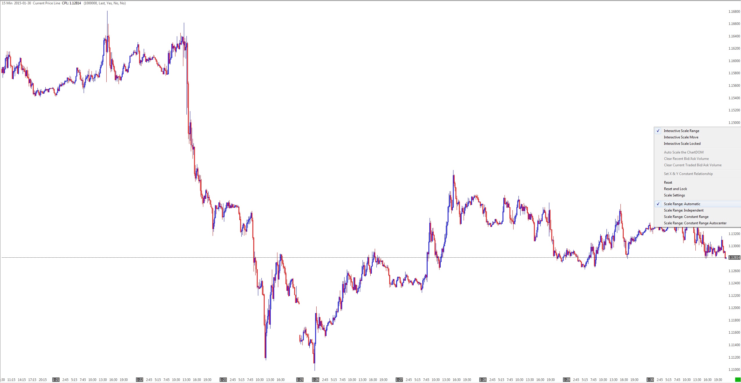 We do not understand this. This does not make any sense. Added are 3 screenshots to display the problem As you can see only the independent scale allows a user to scroll back a mere few days without the chart screwing up. For this reason, the following point is also made redundant: In the case of automatic scaling this does not make any sense. In the case of Constant Range scaling that functions as designed and you may have to make adjustments to the scale range as you scroll back, in which case do not use Constant Range scaling if this is a problem