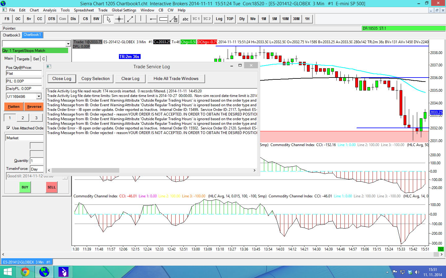 Other than the first two lines in the Trade Service Log that you show in the screenshot, show those error messages to Interactive Brokers. They will be able to help you with them. For the meaning of one of them, refer to this section here: https://www.sierrachart.com/index.php?page=doc/IB.php#TradingErrorMessages Sierra Chart Support - Engineering Level Your definitive source for support. Other responses are from users. Try to keep your questions brief and to the point. Be aware of support policy: https://www.sierrachart.com/index.php?l=PostingInformation.php#GeneralInformation For the most reliable, advanced, and zero cost futures order routing, *change* to the Teton service: Sierra Chart Teton Futures Order Routing Date Time Of Last Edit: 2014-11-11 17:42:53