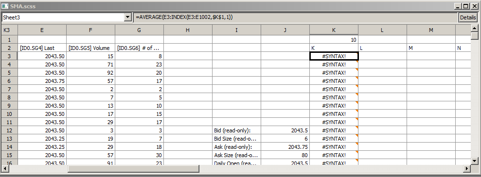 Provide us a simple example explanation which demonstrates a case which cannot be done due to this limitation. We would think it should not be difficult for us to implement another function to accomplish what you want.I offered a simple formula as an example. [There is another way to do it that works:=AVERAGE(OFFSET(E3,0,0,$K$1,1))] But more complex uses of INDEX cannot be easily replicated with other functions, if at all. You are used to doing things a certain way with the Old Spreadsheets based upon how those were designed. With the New Spreadsheets, there needs to be a new look at how to do things. If there is something you cannot do with New Spreadsheets, provide us a simple explanation of it that fits within the concept of spreadsheets, and we will see how to implement it within the general Spreadsheet framework. Sierra Chart Support - Engineering Level Your definitive source for support. Other responses are from users. Try to keep your questions brief and to the point. Be aware of support policy: https://www.sierrachart.com/index.php?l=PostingInformation.php#GeneralInformation For the most reliable, advanced, and zero cost futures order routing, *change* to the Teton service: Sierra Chart Teton Futures Order Routing Date Time Of Last Edit: 2014-11-22 21:04:24