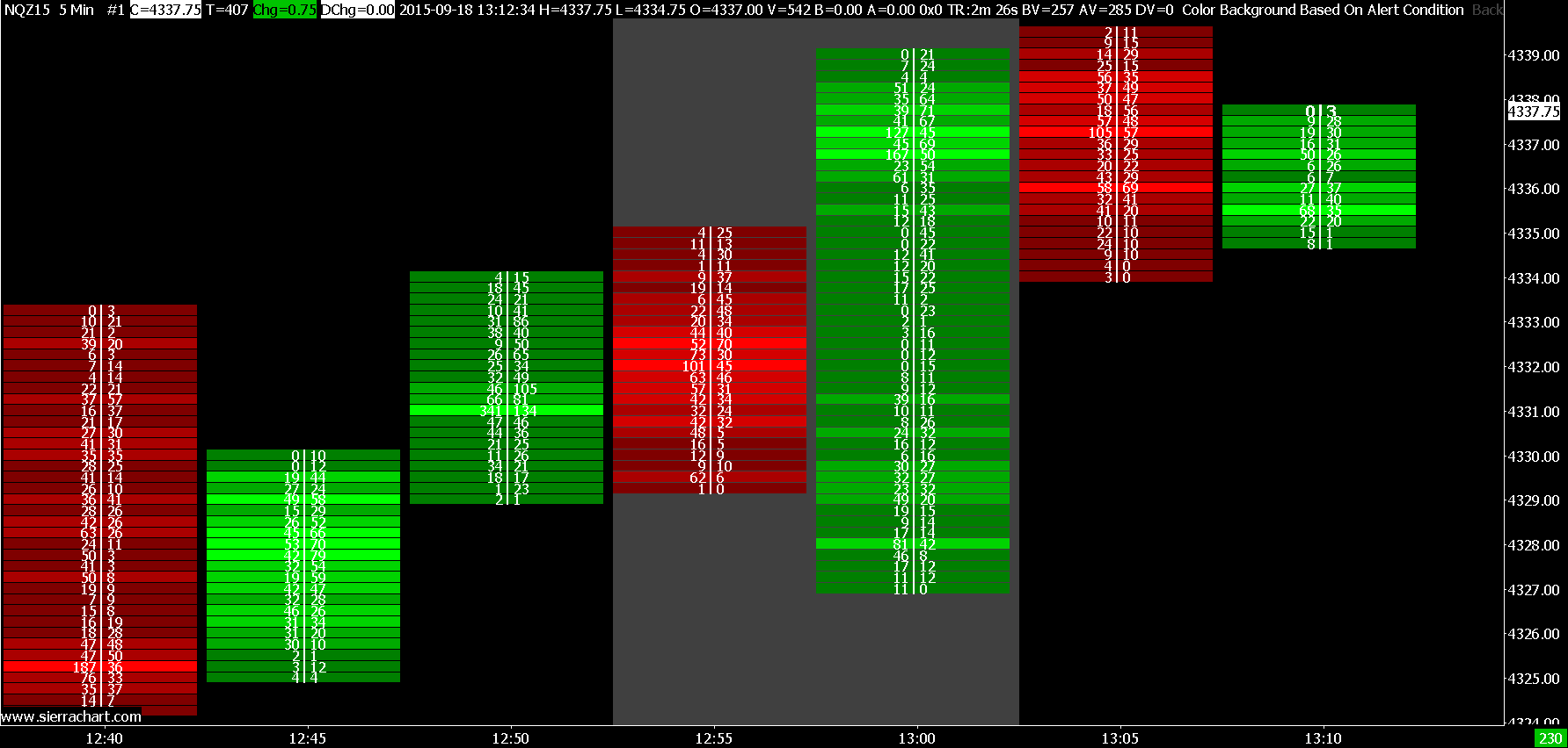 Your formula definitely will not always give you alert in this case because it is not looking for what you are describing: I am using this in a Colour bar based on alert study, but I am finding that bars with ask vol of 8 or more does not always produce an alert. The formula is going to give you an alert if at the High price level of the bar the Ask Volume is greater than or equal to 8. Here is an example of the formula, =AVAP(H, 0) >= 20, using the Color Background Based on Alert Condition: http://www.sierrachart.com/image.php?l=1442597127463.png Sierra Chart Support - Engineering Level Your definitive source for support. Other responses are from users. Try to keep your questions brief and to the point. Be aware of support policy: https://www.sierrachart.com/index.php?l=PostingInformation.php#GeneralInformation For the most reliable, advanced, and zero cost futures order routing, *change* to the Teton service: Sierra Chart Teton Futures Order Routing Date Time Of Last Edit: 2015-09-18 17:29:34