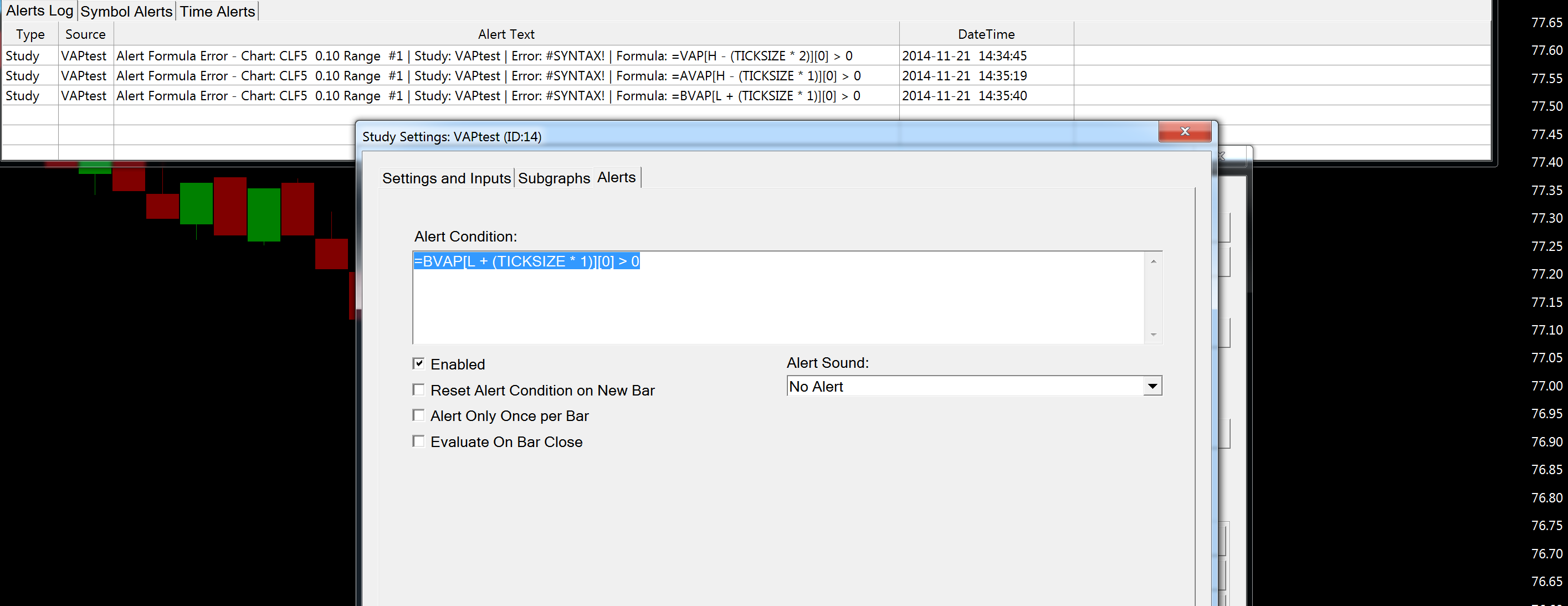 Alert Formula Error - Chart: XAUUSD 5 Min #32 | Error: #SYNTAX! | Formula: =VAP[H - (TICKSIZE * 1)][0]>1 | No alert sound/email We can see that this is still giving a syntax error although support was added for this. We need to look into this again. Sierra Chart Support - Engineering Level Your definitive source for support. Other responses are from users. Try to keep your questions brief and to the point. Be aware of support policy: https://www.sierrachart.com/index.php?l=PostingInformation.php#GeneralInformation For the most reliable, advanced, and zero cost futures order routing, *change* to the Teton service: Sierra Chart Teton Futures Order Routing |