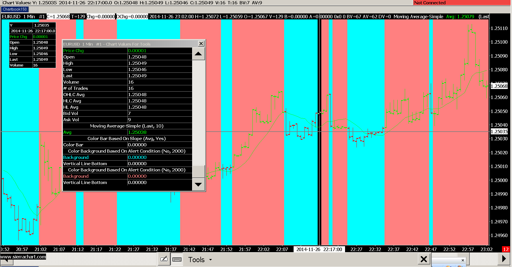 We have done a test and this is what we found: http://www.sierrachart.com/image.php?l=1417161461939.png If you examine with the Chart Values tool, the values of the Color Bar Based on Slope study you will see zero values where the Color Background study does not color the background. This is because there is no slope. The Sierra Chart studies, work very reliably. There will not be any trouble with them like this. Sierra Chart Support - Engineering Level Your definitive source for support. Other responses are from users. Try to keep your questions brief and to the point. Be aware of support policy: https://www.sierrachart.com/index.php?l=PostingInformation.php#GeneralInformation For the most reliable, advanced, and zero cost futures order routing, *change* to the Teton service: Sierra Chart Teton Futures Order Routing |