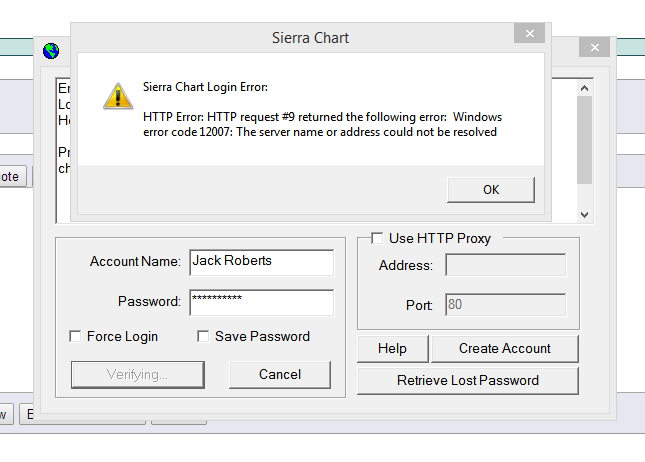 What firewall software is your computer running? Restart your computer and try logging in again. There is a problem with DNS on your side. If restarting does not help, then most likely it is caused by a firewall and you will have to uninstall it from your system. If you are only using the Windows firewall, this will not cause a problem and that cannot be uninstalled. Sierra Chart Support - Engineering Level Your definitive source for support. Other responses are from users. Try to keep your questions brief and to the point. Be aware of support policy: https://www.sierrachart.com/index.php?l=PostingInformation.php#GeneralInformation For the most reliable, advanced, and zero cost futures order routing, *change* to the Teton service: Sierra Chart Teton Futures Order Routing Date Time Of Last Edit: 2014-11-28 18:54:28