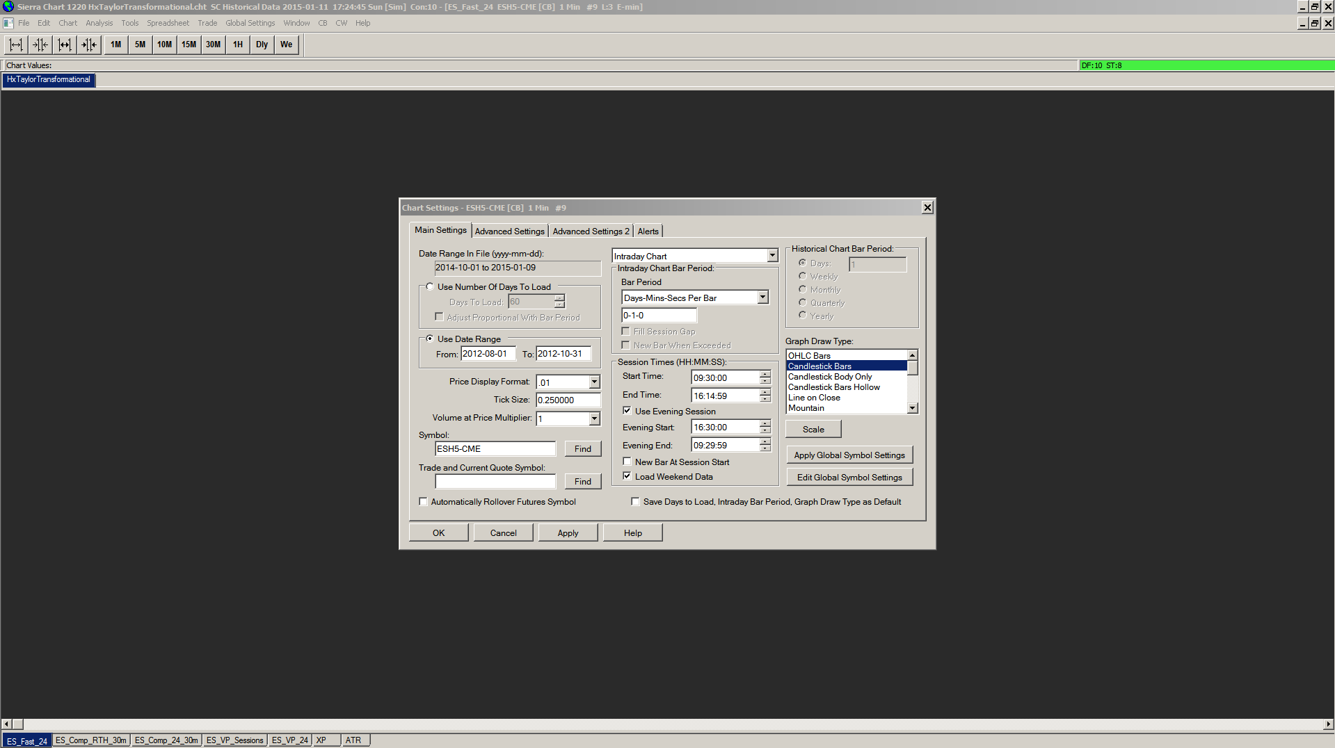 I attach a screenshot to illustrate and paste, here, as your instructions dictate: http://www.sierrachart.com/image.php?l=1421015640485.png This is for ES, set to continuous contract. I have selected Edit => Delete All Data And Download and indicated "No" in response to the prompt, "Do you want to re-download data for the current symbol only?" And I have a blank screen. Please advise, thank you. Software version: 1220 | 2015-01-11 13:14:24 Uses New Spreadsheets | 2015-01-11 13:14:24 Usage end date: 2015-01-13 | 2015-01-11 13:14:24 Enabled for: Advanced Features. | 2015-01-11 13:14:24 Enabled for: Advanced Features 2. | 2015-01-11 13:14:24 Enabled for: Sierra Chart Historical Data Service. | 2015-01-11 13:14:24 Allow Support for Sierra Chart Data Feeds is enabled. | 2015-01-11 13:14:24 Active service: Rithmic Trading | 2015-01-11 13:14:24 Time Zone: -05:00:00 (EST-05EDT+01,M3.2.0/02:00,M11.1.0/02:00) | 2015-01-11 13:14:24 2015-01-11 13:14:24 Local computer clock time | 2015-01-11 13:14:24 2015-01-11 18:14:24 GMT time | 2015-01-11 13:14:24 2015-01-11 13:14:24 Time zone adjusted time | 2015-01-11 13:14:24 Time difference to server time: 16 seconds. | 2015-01-11 13:14:24 Program path: C:\SierraChart\ | 2015-01-11 13:14:24 Data Files path: C:\SierraChart\Data\ | 2015-01-11 13:14:24 OS Version Number: 6.1 | 2015-01-11 13:14:24 Locale Information: C | 2015-01-11 13:14:24 Checking for new symbol settings for rim | 2015-01-11 13:14:24 HTTP connection to www.sierrachart.com:80 (0) | Resolved address sierrachart.com to IP 5.9.8.236 | 2015-01-11 13:14:24 HTTP connection to www.sierrachart.com:80 (1) | Connected. | 2015-01-11 13:14:24 Symbol settings are up-to-date for rim | 2015-01-11 13:14:24 Notice: 2 days of full use Remaining. To continue full use the software and services, | 2015-01-11 13:14:25 purchase more usage time by selecting 'Help >> Add Usage Credit' on the menu. | 2015-01-11 13:14:25 * Rithmic Trading | Port for executable: 49975 | 2015-01-11 13:14:29 Listening socket (892), port 49975 | Closed. | 2015-01-11 13:14:29 Rithmic Trading | Starting server: C:\SierraChart\Rim\DTCBridge.exe | 2015-01-11 13:14:29 HTTP connection to www.sierrachart.com:80 (1) | Closed. No error. | 2015-01-11 13:14:29 HTTP connection to www.sierrachart.com:80 (1) | Shutdown and closed. | 2015-01-11 13:14:29 Rithmic Trading | Connecting to the server 127.0.0.1. Port 49975 | 2015-01-11 13:14:31 Socket (2) | Connected. | 2015-01-11 13:14:31 Rithmic Trading | Connected to server. | 2015-01-11 13:14:31 Rithmic Trading | Sending logon request message. | 2015-01-11 13:14:31 Rithmic Trading | Starting the connection process to data and trading service. | 2015-01-11 13:14:31 Rithmic Trading | Logging is enabled. Log file: C:\SierraChart\Rim\Rithmic.log | 2015-01-11 13:14:31 Rithmic Trading | Connecting to Rithmic 01 US server. | 2015-01-11 13:14:31 Rithmic Trading | Server Alert: Market Data Connection Opened | 2015-01-11 13:14:32 Rithmic Trading | Server Alert: Market Data Connection Login Complete. Result text: "ok" | 2015-01-11 13:14:32 Rithmic Trading | Server Alert: Trading System Connection Opened | 2015-01-11 13:14:33 Rithmic Trading | Server Alert: Trading System Connection Login Complete. Result text: "ok" | 2015-01-11 13:14:33 Rithmic Trading | Server Alert: PnL Connection Opened | 2015-01-11 13:14:33 Rithmic Trading | Server Alert: PnL Connection Login Complete. Result text: "ok" | 2015-01-11 13:14:33 Rithmic Trading | Server Alert: Intraday History Connection Opened | 2015-01-11 13:14:33 Rithmic Trading | Server Alert: Intraday History Connection Login Complete. Result text: "ok" | 2015-01-11 13:14:33 Rithmic Trading | Server Name: SC DTC Bridge. | 2015-01-11 13:14:34 Rithmic Trading | Server protocol version: 5. Client protocol version: 5. There is a protocol match. | 2015-01-11 13:14:34 Rithmic Trading | Successfully connected. IB='OptimusFutures'. | 2015-01-11 13:14:34 Rithmic Trading | Trading is supported. | 2015-01-11 13:14:34 Rithmic Trading | Order cancel and replace is supported. | 2015-01-11 13:14:34 Rithmic Trading | OCO Orders supported. | 2015-01-11 13:14:34 Rithmic Trading | Requesting Trade Positions data. | 2015-01-11 13:14:39 Date rule based rollover from ESH5-CME to next contract occurs at 2015-03-12. | 2015-01-11 13:24:01 Checking Intraday data file for symbol ESH5-CME for the date range from 2014-12-11 to 0. | 2015-01-11 13:24:01 Checking Daily data file for symbol ESH15 for the date range from 2014-12-11 to 2015-01-09. | 2015-01-11 13:24:01 ESH5-CME [CB] 30 Min #4 | Symbols used for continuous contract chart: | 2015-01-11 13:24:01 ESH5-CME | 2015-01-11 13:24:01 ESH5-CME [CB] 30 Min #4: Performing continuous futures contract back adjustment calculations. | 2015-01-11 13:24:01 Date rule based rollover from ESZ4-CME to next contract occurs at 2014-12-11. | 2015-01-11 13:24:01 Date rule based rollover from ESH5-CME to next contract occurs at 2015-03-12. | 2015-01-11 13:24:01 Checking Intraday data file for symbol ESZ4-CME for the date range from 2014-09-11 to 2014-12-11. | 2015-01-11 13:24:01 Checking Daily data file for symbol ESZ14 for the date range from 2014-09-11 to 2014-12-11. | 2015-01-11 13:24:01 Checking Intraday data file for symbol ESH5-CME for the date range from 2014-12-11 to 0. | 2015-01-11 13:24:01 Checking Daily data file for symbol ESH15 for the date range from 2014-12-11 to 2015-01-09. | 2015-01-11 13:24:01 ESH5-CME [CB] 1 Min #9 | Symbols used for continuous contract chart: | 2015-01-11 13:24:01 ESZ4-CME | 2015-01-11 13:24:01 ESH5-CME | 2015-01-11 13:24:01 ESH5-CME [CB] 1 Min #9: Performing continuous futures contract back adjustment calculations. | 2015-01-11 13:24:01 ESH5-CME [CB] 1 Min #9: ESZ4-CME Open price on 2014-12-11 is 2026.25. | 2015-01-11 13:24:01 ESH5-CME [CB] 1 Min #9: ESH5-CME Open price on 2014-12-11 is 2019.75. | 2015-01-11 13:24:01 ESH5-CME [CB] 1 Min #9: ESZ4-CME price difference to ESH5-CME is -6.5. | 2015-01-11 13:24:01 ESH5-CME [CB] 1 Min #9: Back adju