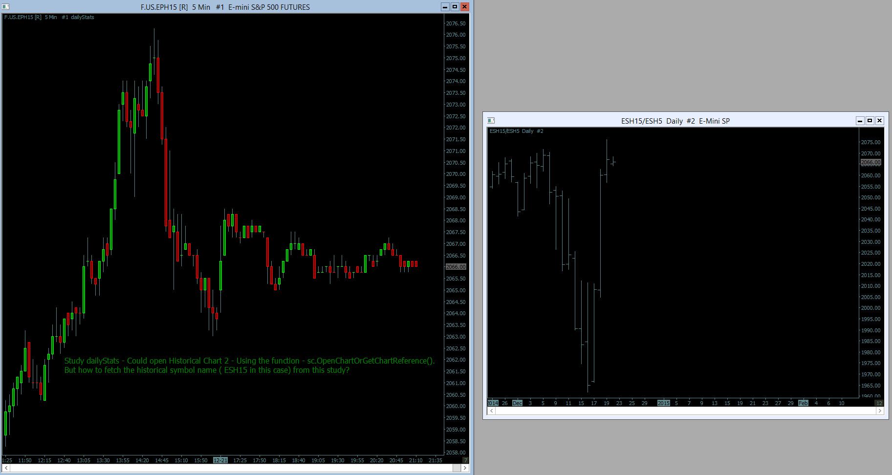Even when I could open the Historical Chart from one of the main charts ( from chart 1 - could open chart 2 (daily chart). But how can I fetch the historical symbol name for the study on chart 1? if there is a possibility to add a study on chart 2 from study on chart 1 - I can then populate this symbol automatically from custom study. Appreciate any input on this. Thanks Date Time Of Last Edit: 2014-12-22 03:23:28