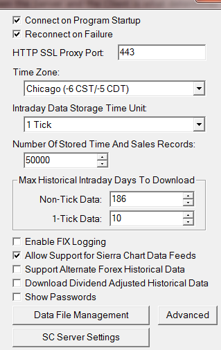 Hello, the problem with long data download is still here. I have got normal internet connection, I think this is not that case. Problém maybe that Sierra always start downloading intraday data for ES, YM and NQ from the year 2013 ! I do not know why that happens. I have different chartbooks and only with 4 markets: NQ, ES, YM, EMD and in each chart I have checked to download maximum 100 days - so it is not definately the year 2013. In the last chartbook I have 3 markets i daily timeframe but only as the historical data (not intraday) . What I have done, that opend data file and throw out all files with 2013. Especially this ES-201312-GLOBEX.scid. But when I run Sierra again, connected to IB, than again these files appeared in the data file ! Pls help me to solve this. Regards Software version: 1261 | 2015-06-18 14:32:16 Uses New Spreadsheets | 2015-06-18 14:32:16 Usage end date: 2015-09-18 | 2015-06-18 14:32:16 Enabled for: Advanced Features. | 2015-06-18 14:32:16 Enabled for: Advanced Features 2. | 2015-06-18 14:32:16 Enabled for: Sierra Chart Historical Data Service. | 2015-06-18 14:32:16 Enabled for: Sierra Chart Real-Time Exchange Data Feed. | 2015-06-18 14:32:16 Enabled for: CME, CBOT, NYMEX, COMEX exchanges for trading accounts. | 2015-06-18 14:32:16 Received 1 data feed usernames. | 2015-06-18 14:32:16 Allow Support for Sierra Chart Data Feeds is enabled. | 2015-06-18 14:32:16 Active service: Interactive Brokers | 2015-06-18 14:32:16 Time Zone: -05:00:00 (CST-06CDT+01,M3.2.0/02:00,M11.1.0/02:00) | 2015-06-18 14:32:16 2015-06-18 21:32:16 Local computer clock time | 2015-06-18 14:32:16 2015-06-18 19:32:16 GMT time | 2015-06-18 14:32:16 2015-06-18 14:32:16 Time zone adjusted time | 2015-06-18 14:32:16 Time difference to server time: 1 seconds. | 2015-06-18 14:32:16 Program path: C:\SierraChart\ | 2015-06-18 14:32:16 Data Files path: C:\SierraChart\Data\ | 2015-06-18 14:32:16 OS Version Number: 6.1 | 2015-06-18 14:32:16 Locale Information: C | 2015-06-18 14:32:16 Checking for new symbol settings for ib | 2015-06-18 14:32:16 HTTP connection to www.sierrachart.com:80 (0) | Resolved address sierrachart.com to IP 5.9.8.236 | 2015-06-18 14:32:16 HTTP connection to www.sierrachart.com:80 (1) | Connected. | 2015-06-18 14:32:16 Symbol settings are up-to-date for ib | 2015-06-18 14:32:17 Interactive Brokers: Connecting to 127.0.0.1:7496 | 2015-06-18 14:32:21 Socket (2) | Connected. | 2015-06-18 14:32:21 Socket connected to TWS. Sending client version: 62. Waiting for acceptance. | 2015-06-18 14:32:21 HTTP connection to www.sierrachart.com:80 (1) | Closed. No error. | 2015-06-18 14:32:22 HTTP connection to www.sierrachart.com:80 (1) | Shutdown and closed. | 2015-06-18 14:32:22 File >> Disconnect selected. | 2015-06-18 14:32:22 Socket (2) | Shutdown and closed. | 2015-06-18 14:32:22 Interactive Brokers | Failed to connect to the data and trade server. | 2015-06-18 14:32:22 * Note: Is the Interactive Brokers TWS software running and is it enabled for socket clients? | 2015-06-18 14:32:22 * Interactive Brokers | Disconnected. | 2015-06-18 14:32:22 Date rule based rollover from YM-201506-ECBOT to next contract occurs at 2015-06-11. | 2015-06-18 14:32:30 Date rule based rollover from YM-201509-ECBOT to next contract occurs at 2015-09-10. | 2015-06-18 14:32:30 Checking Intraday data file for symbol YM-201506-ECBOT for the date range from 2015-03-12 to 2015-06-11. | 2015-06-18 14:32:30 Checking Daily data file for symbol YM-201506-ECBOT for the date range from 2015-03-12 to 2015-06-11. | 2015-06-18 14:32:30 Checking Intraday data file for symbol YM-201509-ECBOT for the date range from 2015-06-11 to 0. | 2015-06-18 14:32:30 Checking Daily data file for symbol YM-201509-ECBOT for the date range from 2015-06-11 to 2015-06-18. | 2015-06-18 14:32:30 YM-201509-ECBOT [CB] 2 Min #1 | Symbols used for continuous contract chart: | 2015-06-18 14:32:30 YM-201506-ECBOT | 2015-06-18 14:32:30 YM-201509-ECBOT | 2015-06-18 14:32:30 YM-201509-ECBOT [CB] 2 Min #1: Performing continuous futures contract back adjustment calculations. | 2015-06-18 14:32:30 YM-201509-ECBOT [CB] 2 Min #1: YM-201506-ECBOT Open price on 2015-06-11 is 18010. | 2015-06-18 14:32:30 YM-201509-ECBOT [CB] 2 Min #1: YM-201509-ECBOT Open price on 2015-06-11 is 17916. | 2015-06-18 14:32:30 YM-201509-ECBOT [CB] 2 Min #1: YM-201506-ECBOT price difference to YM-201509-ECBOT is -94. | 2015-06-18 14:32:30 YM-201509-ECBOT [CB] 2 Min #1: Back adjust amount for symbol YM-201506-ECBOT is -94. | 2015-06-18 14:32:30 Date rule based rollover from NQ-201506-GLOBEX to next contract occurs at 2015-06-11. | 2015-06-18 14:32:30 Date rule based rollover from NQ-201509-GLOBEX to next contract occurs at 2015-09-10. | 2015-06-18 14:32:30 Checking Intraday data file for symbol NQ-201506-GLOBEX for the date range from 2015-03-12 to 2015-06-11. | 2015-06-18 14:32:30 Checking Daily data file for symbol NQ-201506-GLOBEX for the date range from 2015-03-12 to 2015-06-11. | 2015-06-18 14:32:30 Checking Intraday data file for symbol NQ-201509-GLOBEX for the date range from 2015-06-11 to 0. | 2015-06-18 14:32:30 Checking Daily data file for symbol NQ-201509-GLOBEX for the date range from 2015-06-11 to 2015-06-18. | 2015-06-18 14:32:30 NQ-201509-GLOBEX [CB] 2 Min #2 | Symbols used for continuous contract chart: | 2015-06-18 14:32:30 NQ-201506-GLOBEX | 2015-06-18 14:32:30 NQ-201509-GLOBEX | 2015-06-18 14:32:30 NQ-201509-GLOBEX [CB] 2 Min #2: Performing continuous futures contract back adjustment calculations. | 2015-06-18 14:32:30 NQ-201509-GLOBEX [CB] 2 Min #2: NQ-201506-GLOBEX Open price on 2015-06-11 is 4486.25. | 2015-06-18 14:32:30 NQ-201509-GLOBEX [CB] 2 Min #2: NQ-201509-GLOBEX Open price on 2015-06-11 is 4480. | 2015-06-18 14:32:30 NQ-201509-GLOBEX [CB] 2 Min #2: NQ-201506-GLOBEX price difference to NQ-201509-GLOBEX is -6.25. | 2015-06-18 14:32:30 NQ-201509-GLOBEX [CB] 2 Min #2: Back adjust amount for symbol NQ-201506-GLOBEX is -6.25. | 2015-06-18 14:32:30 Date rule based rol