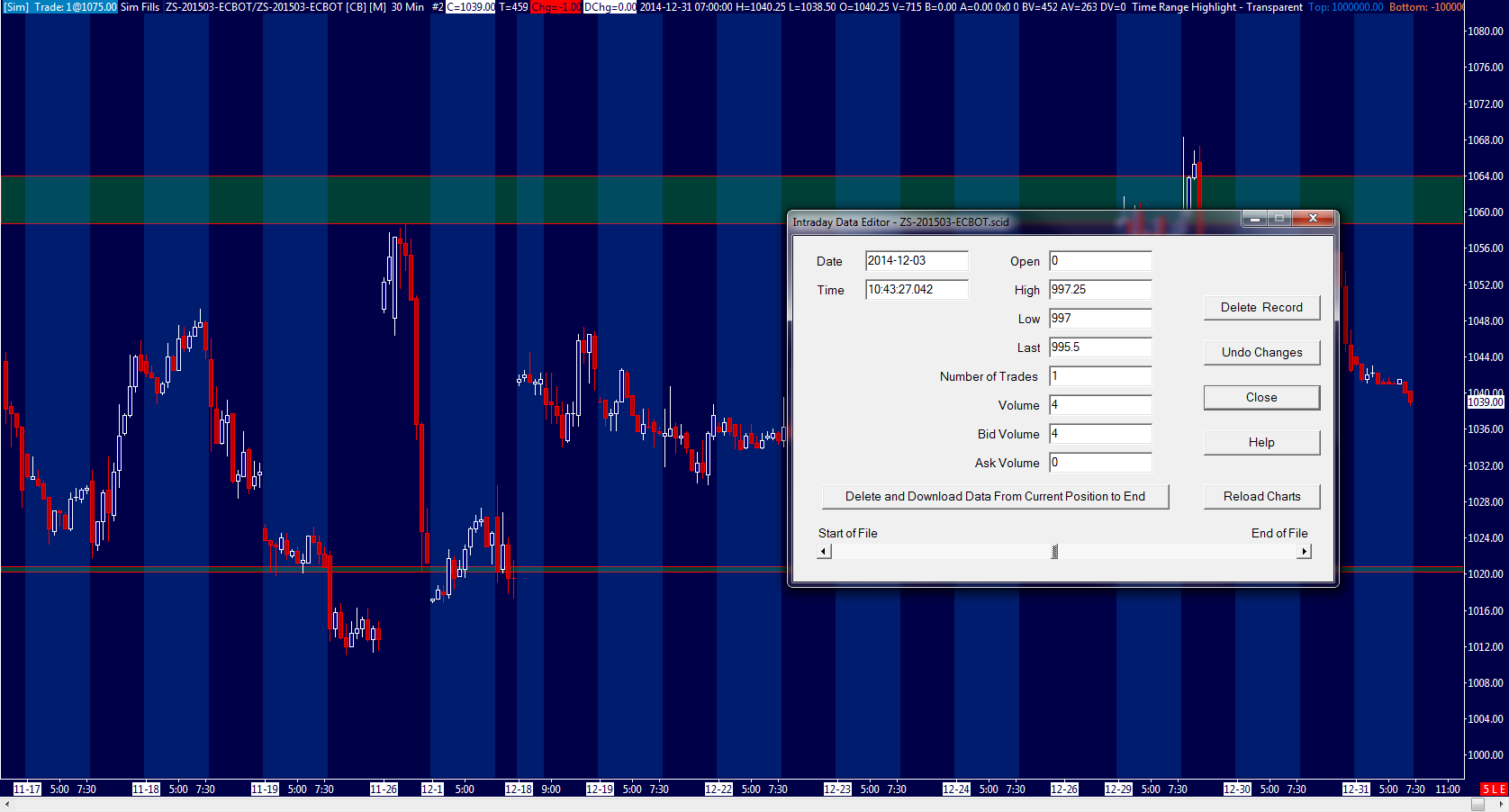 Hello, I have problems with displaying datas for chart ZS-2015-03. I do not see datas from 19.11.2014 to 26.11.2014 and from 1.12.2014 to 18.12.2014 in the chart. I have deleted and downloaded datas many times again and again but nothing happens. But if I go to the Intraday data editor - there it seems the datas are there, but are not displayed in the chart, see attachements. |
