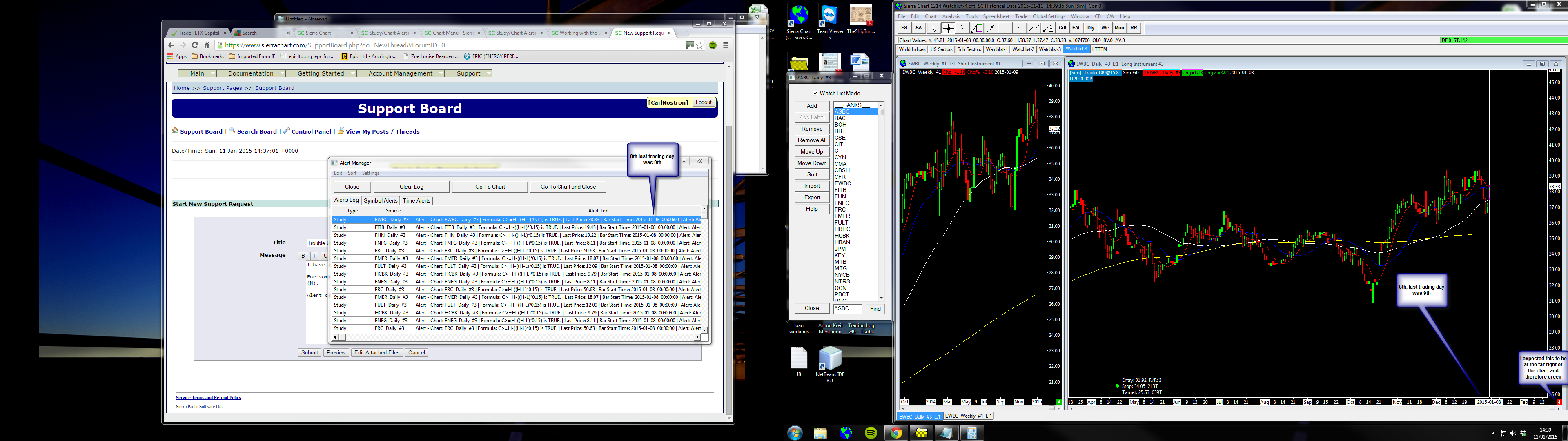 I have setup an alert condition which I am using to scan a Watchlist of Symbols. The Scan finds Symbols that close, within 15% from the high of the last days trading on a Daily bar. For some reason, the scan brings up results based on the previous days close (i.e. N-1) rather than the last trading days close (N). i.e. the 8th which is Thursday instead of the 9th which is Friday. Alert condition: C>=H-((H-L)*0.15) I have Alert Only Once Per Bar, Evaluate on Bar Close and Reset Alert Condition On new Bar all Selected in Chart Settings-->Alerts Tab See image to make more sense. Thanks for your help. |