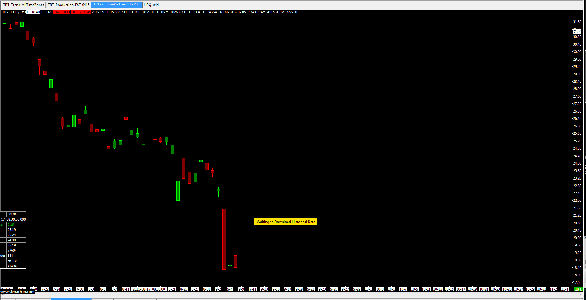 Are these US stocks or from another exchange? At the time you have this problem, provide a copy of the Message Log by following these instructions: http://www.sierrachart.com/index.php?l=PostingInformation.php#MessageLog We also need to know one of the symbols of the charts that shows "Waiting to download". Sierra Chart Support - Engineering Level Your definitive source for support. Other responses are from users. Try to keep your questions brief and to the point. Be aware of support policy: https://www.sierrachart.com/index.php?l=PostingInformation.php#GeneralInformation For the most reliable, advanced, and zero cost futures order routing, *change* to the Teton service: Sierra Chart Teton Futures Order Routing Date Time Of Last Edit: 2015-09-22 15:28:22