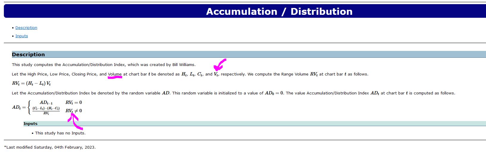 I see that in the "more understandable format" http://www.sierrachart.com/index.php?page=doc/doc_TechnicalStudiesReference.html#s42 you are bringing in the term 'volume'. However in reading about Williams Accum / Dist, he does not use volume in the calculation. Then reading the Sierra source code, I don't see volume in the code. Is this Study, using Volume in it's calculation? (hopefully not) Another question: I'm assuming in this study that the total values from the study are cumulative (add or subtract values along the way to arrive at a constantly changing cumulative value) Hopefully, this Study does not use Volume and the values are accumulating along the way. I'm trying to verify if Sierra's Willams AD is the same as described here: (From Technical Analysis Book) **To calculate Williams' Accumulation/Distribution indicator, first determine the True Range High ("TRH") and True Range Low ("TRL"). Today's accumulation/distribution is then determined by comparing today's closing price to yesterday's closing price. If today's close is greater than yesterday's close: If today's close is less than yesterday's close: If today's close is equal to yesterday's close: The Williams' Accumulation/Distribution indicator is a cummulative total of these daily values.** Thanks for clarifying. Date Time Of Last Edit: 2023-03-18 14:58:39
