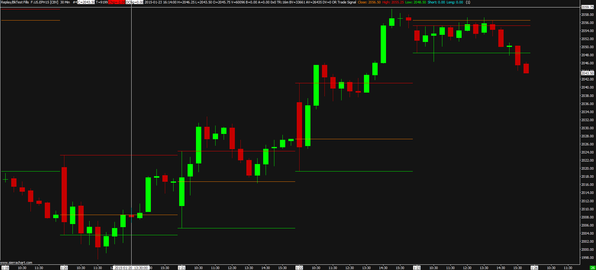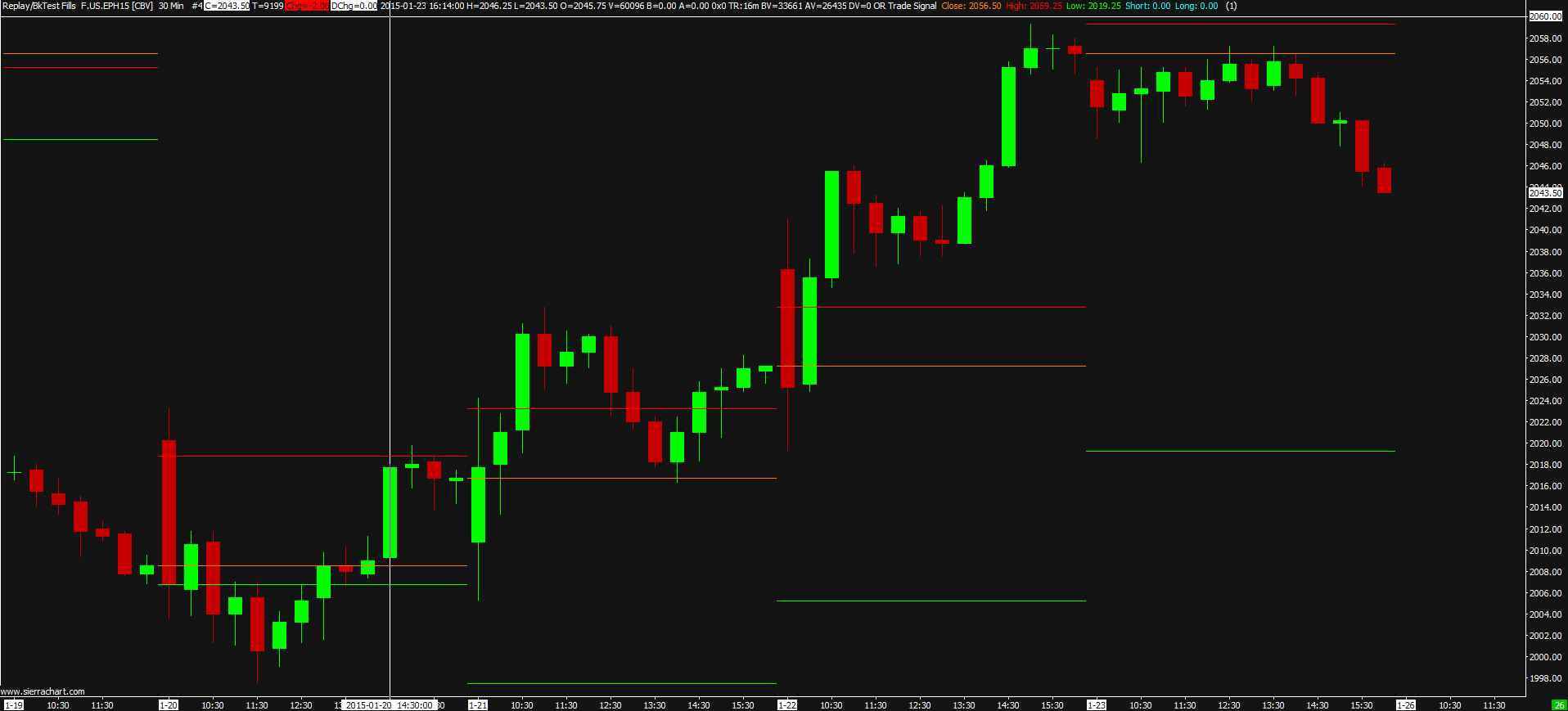 There a study I wrote (began with user contributed source code) that plots the previous day high, low, and close. The study is working correctly on the chart. However after running the AutoTrade System Based Bar Backtest the high and low plots change to plot the high and low of the beginning bar of the new day. THe close plot does not change. Running Chart Recalculate, the high and low plots are fixed. I want to use this code in a strategy and backtest it, but running the backtest breaks the code. I'm thinking that a possible fix would involve a new array that stores the high and low. However, those who are more familiar with SC backtesting might have a better fix. Also, I'm curious about how the backtesting is changing the behavior. Screenshot images below. The first image is of the study plots before the backtest was run. Plots are of the previous day: Red = High, Orange = Close, Green = Low http://www.sierrachart.com/image.php?l=142220467574.png http://www.sierrachart.com/image.php?l=1422204753412.png SCSFExport scsf_ORTradeSignal(SCStudyGraphRef sc) { int sc_index = 0; SCSubgraphRef Output1 = sc.Subgraph[sc_index++]; SCSubgraphRef Output2 = sc.Subgraph[sc_index++]; SCSubgraphRef Output3 = sc.Subgraph[sc_index++]; // // Declare Inputs // int InputIndex = 0; SCInputRef DistanceFromCandle = sc.Input[InputIndex++]; if (sc.SetDefaults) { sc.GraphName="OR Trade Signal"; sc.StudyDescription="Opening Range Trade Signals"; // // Default Input Settings // DistanceFromCandle.Name = "DistanceOfSignalFromBar"; DistanceFromCandle.SetInt(1); // // Default Output Settings // Output1.Name="Close"; Output1.DrawStyle = DRAWSTYLE_DASH; Output1.PrimaryColor = RGB(255,128,0); Output2.Name="High"; Output2.DrawStyle = DRAWSTYLE_DASH; Output2.PrimaryColor = RGB(255,0,0); Output3.Name="Low"; Output3.DrawStyle = DRAWSTYLE_DASH; Output3.PrimaryColor = RGB(0,255,0); sc.ScaleRangeType = SCALE_SAMEASREGION; sc.GraphRegion = 0; sc.AutoLoop = 0; //0 for manual looping sc.FreeDLL = FREEDLL; sc.DrawZeros=0; return; } /***************************************************************************** * * Create Sub-Graph outputs * ****************************************************************************/ float& High = sc.PersistVars->f1; float& Low = sc.PersistVars->f2; float& DailyHigh = sc.PersistVars->f3; float& DailyLow = sc.PersistVars->f4; float& Close = sc.PersistVars->f5; float& DailyClose = sc.PersistVars->f6; int& iDstart = sc.PersistVars->i1; int plot_offset = DistanceFromCandle.GetInt(); int i,j; if (sc.UpdateStartIndex == 0) { iDstart=0; High = sc.BaseDataIn[SC_HIGH][0]; Low = sc.BaseDataIn[SC_LOW][0]; } // Manual looping, therefore all processing is done in this for loop // //loop for all bars starting at the farthest back in time for (i = sc.UpdateStartIndex; i < sc.ArraySize; i++) { int p = i-1, BarDoW, PreviousBarDoW; BarDoW = sc.BaseDateTimeIn[i].GetDayOfWeek(); //get this bar's DoW PreviousBarDoW = sc.BaseDateTimeIn[p].GetDayOfWeek(); //get previous' DoW // DayOfWeekEnum SUNDAY = 0, MONDAY = 1, TUESDAY = 2, WEDNESDAY = 3, // THURSDAY = 4, FRIDAY = 5, SATURDAY = 6 if(BarDoW != PreviousBarDoW) // new day { DailyHigh = High; DailyLow = Low; High = sc.BaseDataIn[SC_HIGH][i]; Low = sc.BaseDataIn[SC_LOW][i]; DailyClose = Close; //Get the HL for the first minute FirstMinHigh = sc.BaseDataIn[SC_HIGH][i] + 0.75; FirstMinLow = sc.BaseDataIn[SC_LOW][i] - 0.75; } else //update the HLC for the day { Close = sc.BaseDataIn[SC_LAST][i]; if(sc.BaseDataIn[SC_HIGH][i] > High) High = sc.BaseDataIn[SC_HIGH][i]; if(sc.BaseDataIn[SC_LOW][i] < Low) Low = sc.BaseDataIn[SC_LOW][i]; } //Display outputs Output1[i] = DailyClose; Output2[i] = DailyHigh; Output3[i] = DailyLow; } } |
