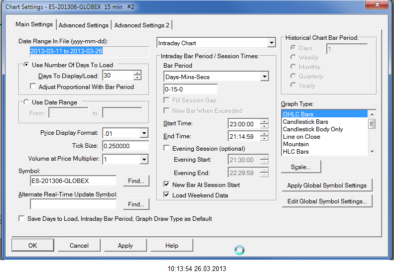 I have updated now. The original reason for going back to a previous version was that the same problem occurred as now. Both symbols do not work (ES-201306-GLOBEX, ES-201306-GLOBEX-USD): Currently no data in file to display. Will start historical data download and real-time updates. File: C:\SierraChart\Data\ES-201306-GLOBEX-USD.scid | 2013-03-26 03:36:34 |