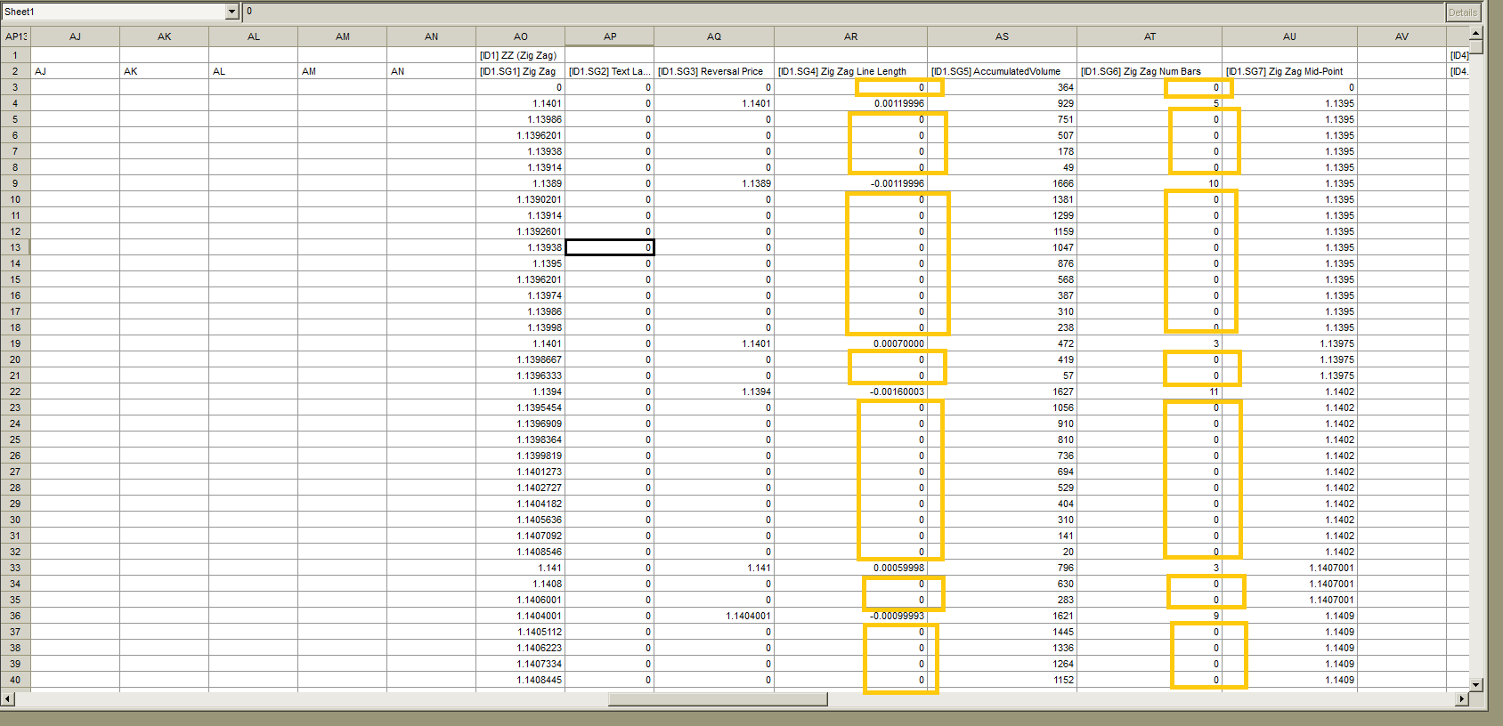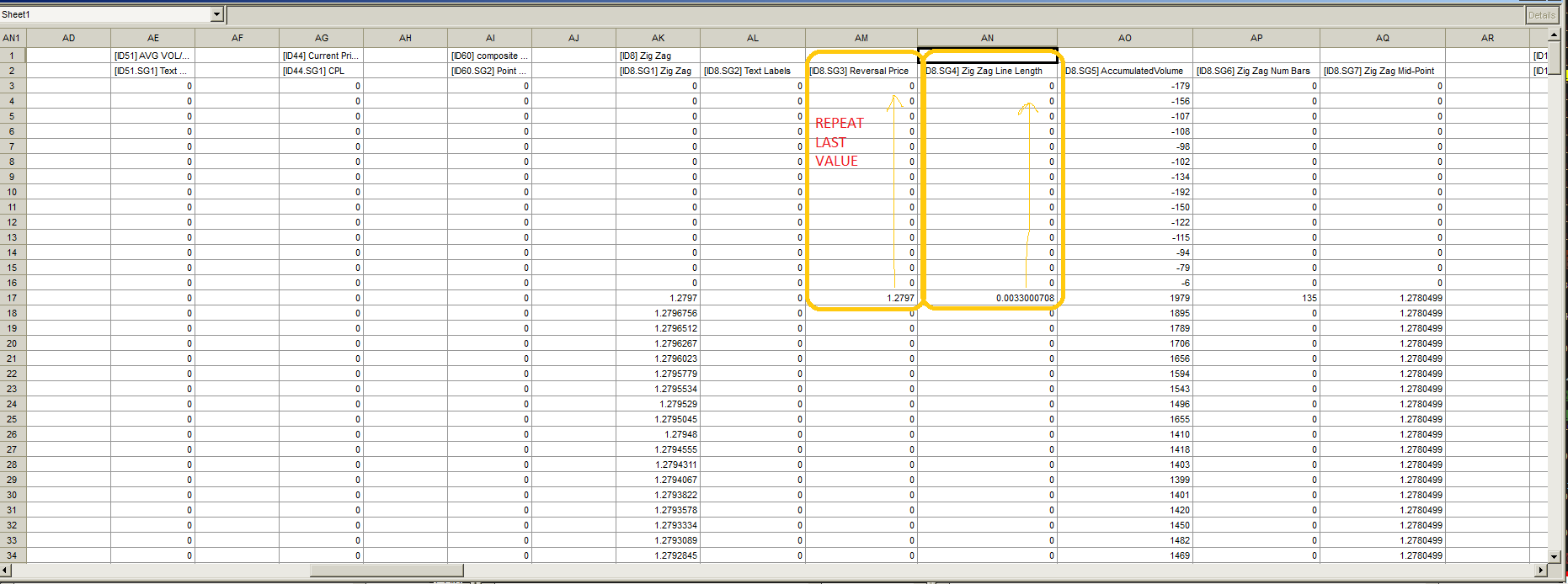 let's be clear, the issue is with ZigZag and no improvements have been made. these are the issues you are referring to, fixed in v1234 : >>Low-level improvements to the Study/Price Overlay study to better work with studies that are displaced and studies that recalculate at bars earlier than the last bar in the source chart, like the Zig Zag study. >>The Study/Price Overlay study and the Spreadsheet studies now properly output data from the study like the Zig Zag study that change at bars earlier than the last bar in the chart. you can see on the attached spreadsheet that ZigZag itself is what needs fixing. Line Length should have an actual value at all times, not zero (unless there is in fact no price movement since the start of the swing). why Line Length is zero at all of these points is beyond me. please explain how it is correct to say that the length of the swing is zero when in fact price has moved from the start of the swing. and ditto for Number of Bars. where you see zeroes on the spreadsheet, this is incorrect because the number of bars from the beginning of the swing is not being reported. again, i am asking to please fix these issues or explain why not. thank you. Date Time Of Last Edit: 2015-02-27 19:13:01