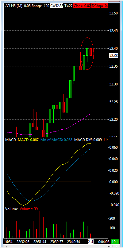 Notice the area circled in red on the chart. This is a 5 tick range bar chart for CL. How can a bar be 4 ticks??? The high was 52.40, low 52.36...and you can see it is one tick short of 5 with your eye.I have seen this twice before. Thanks Tom |