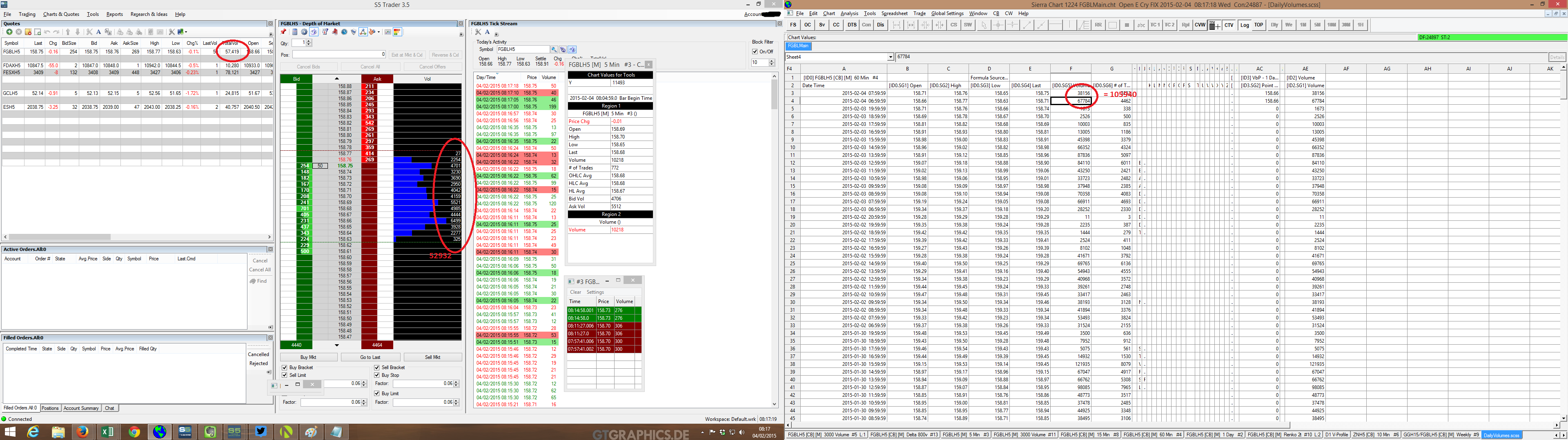 I'm having a problem with volume. For some reason, sierra is roughly doubling up my volume. Please see attached image. I have a spreadsheet study on a 60m chart, which shows the volume traded. For 04-Feb-15 it has so far accumulated 105,540 contracts, whereas the quoteboard only shows 57,419, or summing up the volume at price on the DOM gives 52,932. Now I don't expect the quoteboard and the tick volume to add up (as quoteboard is usually more), but there is just no way I can have more traded on my charts than total volume on quoteboard. Also, did a quick comparison with another trader - looking at a 5 minute bar 04-Feb-15 08:05:00 - 08:09:59 should have traded 5,109 contracts, looking at my charts, Sierra has it as 10,218 (exactly double). I'm running Sierra and using your Eurex data feed. What the hell is going on here? Log below:(Log removed) Date Time Of Last Edit: 2015-02-04 08:46:07