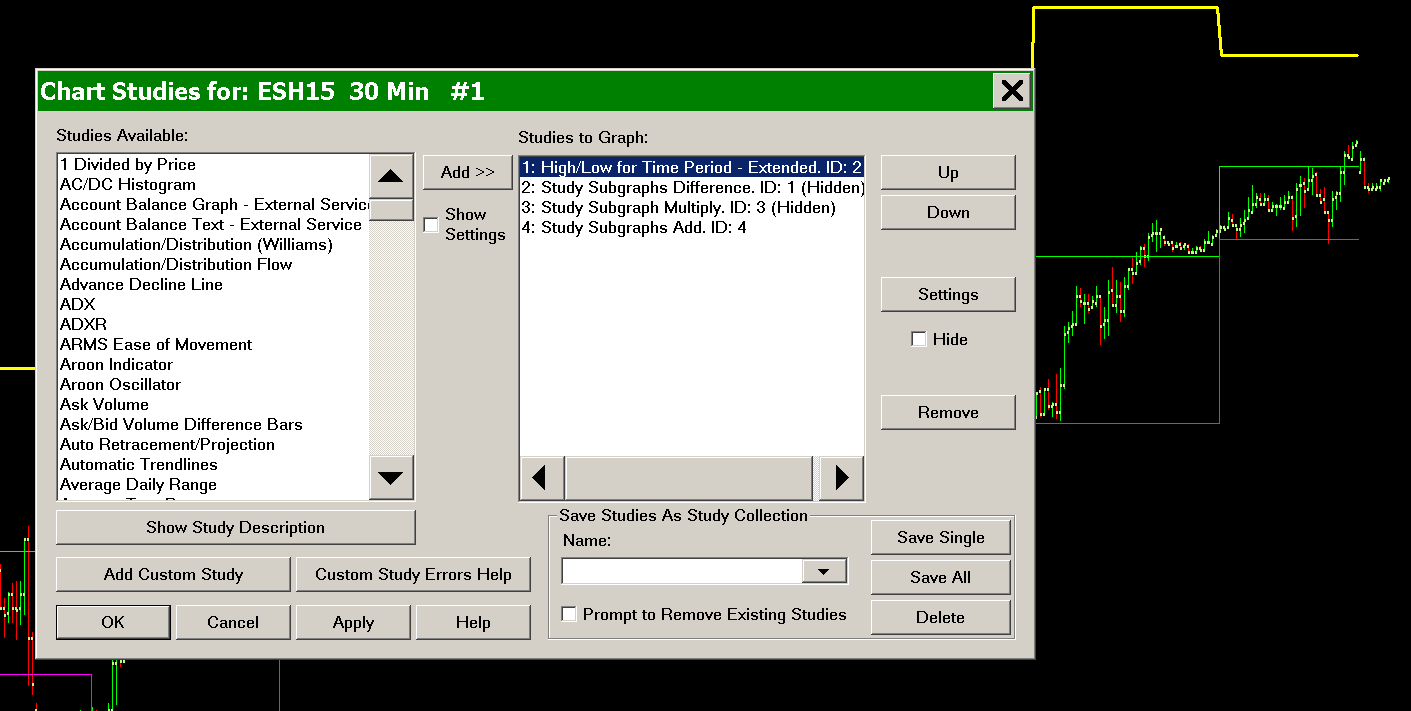 The first step is to write out step-by-step the method of calculation and then you use a combination of the Study Subgraph(s) Arithmetic studies to arrive at that calculation. All of the Arithmetic studies that are used for intermediate calculations but are not needed to be displayed, need to be Hidden. We have attached an image of the studies that you would use in this example. Sierra Chart Support - Engineering Level Your definitive source for support. Other responses are from users. Try to keep your questions brief and to the point. Be aware of support policy: https://www.sierrachart.com/index.php?l=PostingInformation.php#GeneralInformation For the most reliable, advanced, and zero cost futures order routing, *change* to the Teton service: Sierra Chart Teton Futures Order Routing Date Time Of Last Edit: 2015-02-24 04:41:39
