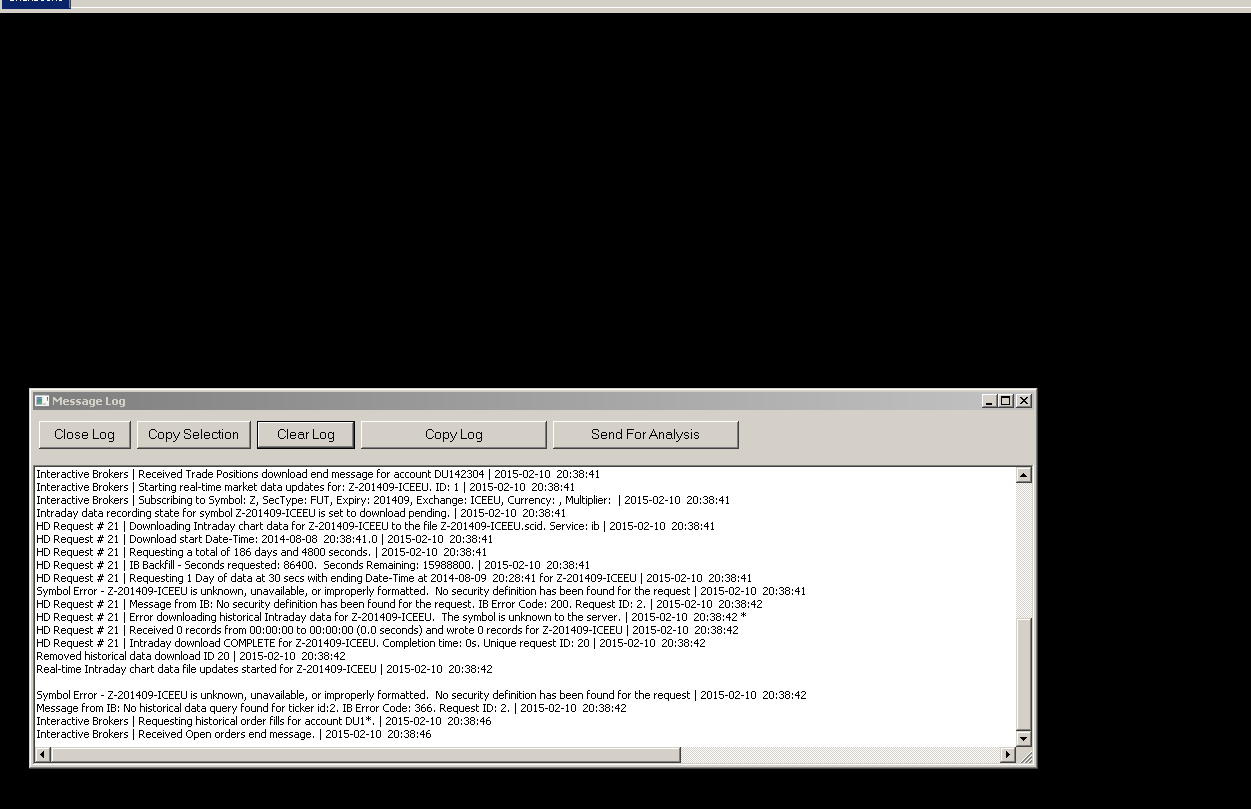 Our primary concern is about Sierra Chart starting up with an error in the Alerts Manager. We understand this problem is now solved for you. The underlying problem which we think is causing it, will be fixed in the next release. As far as a problem logging into the TWS Login window, follow the instructions here for this: http://www.sierrachart.com/index.php?page=doc/IB.php#AutomaticallyLogin There is no guarantee that feature will work. We have also verified from your Message Log that this is a valid Interactive Brokers symbol: Z-201503-ICEEU-GBP-1000 Slow historical data downloading will be due to downloading too many days of Intraday history. Sierra Chart Support - Engineering Level Your definitive source for support. Other responses are from users. Try to keep your questions brief and to the point. Be aware of support policy: https://www.sierrachart.com/index.php?l=PostingInformation.php#GeneralInformation For the most reliable, advanced, and zero cost futures order routing, *change* to the Teton service: Sierra Chart Teton Futures Order Routing Date Time Of Last Edit: 2015-02-18 20:32:48