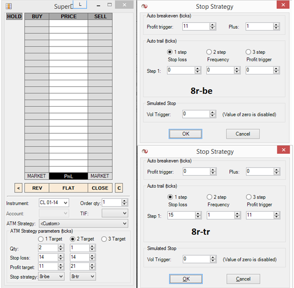 Hi, I have an atm strategy on ninja trader that i need to reproduce on Sierra Chart. 3 contracts Initial Stop: 14 Ticks 2 contracts with First Target: 11 Ticks At First Target Stop Moves to -5 Ticks and Trails the Trade Third contract with Second Target: 21 Ticks I attach you an image of the atm on ninja. Could you explain me how i can reproduce this atm on sierra chart please. Regards Date Time Of Last Edit: 2015-02-10 14:48:03