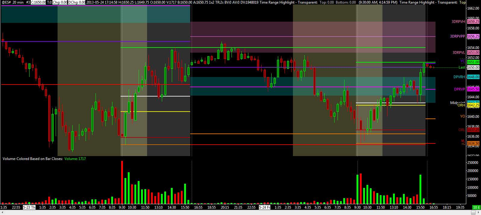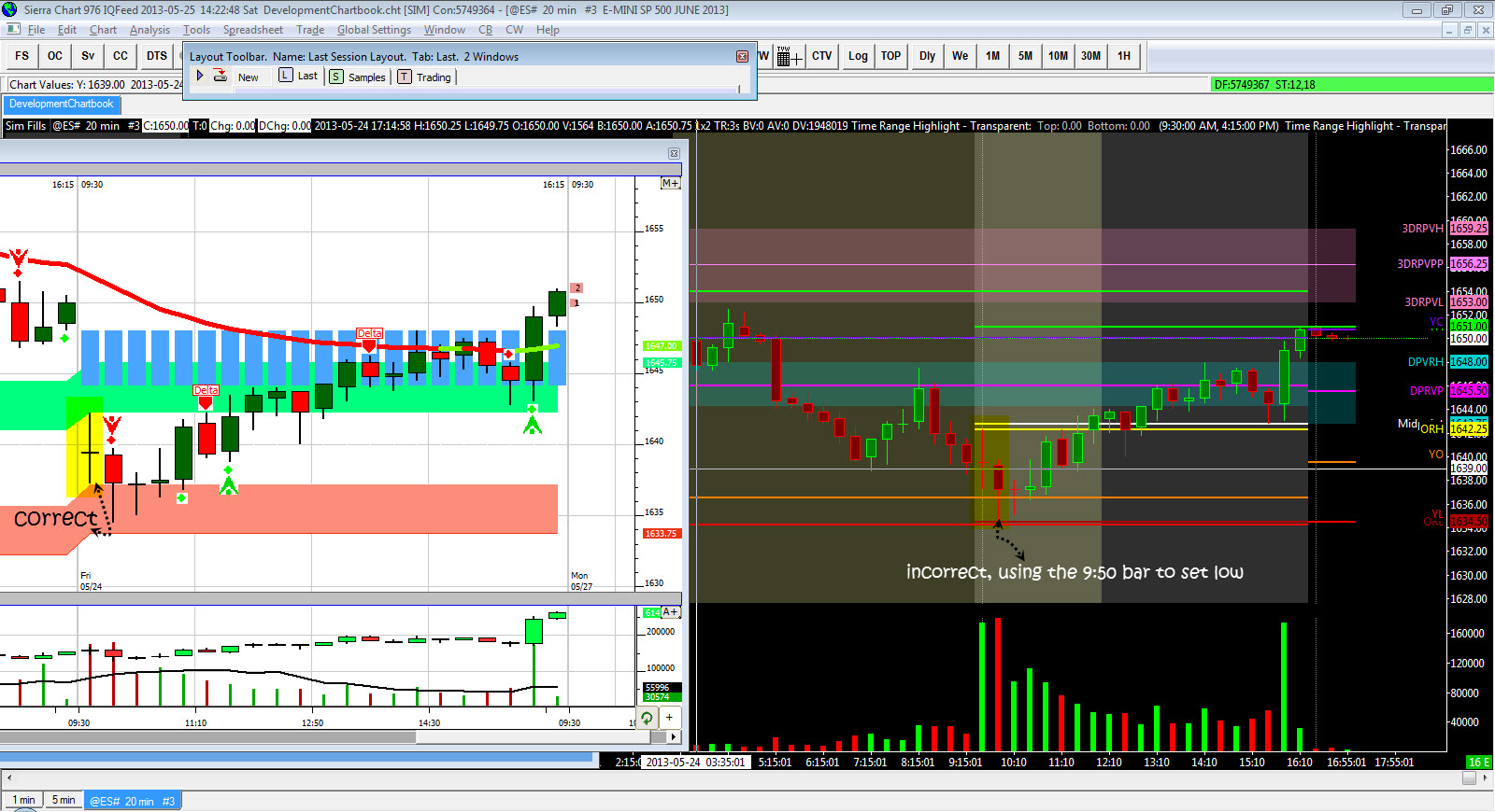 new user to SC, since thursday night when I downloaded the program for testing... I cant find a clear answer to this in everything that I've read... so I figure I ask here... off the bat, I subscribe to the ACD method of trading.. so having a properly defined OR, PVR, and RPVR is important to me... I setup my day session to start at 9:30:00 and end at 16:15:00, night session starts at 16:15:01 and ends at 9:29:59 .... when I setup my pivots, ohlc, etc... I noticed that everything is off with time.. assuming I use 20m OR, and 20M bars... the Close of the 9:50 bar and not the 9:30 bar is being used to determine the high/low of the OR... does SC bars get build with the start time? meaning... the 9:30 20min bar begins at 09:30:00 and ends at 09:49:59? with 9:50 being the second bar of the day? curious because my other two platforms dont build the bars that way... the 20min bar with a session starting at 9:30 is the 9:50 bar... see attached for what I mean... so I guess my question is, how does SC build its bars? |