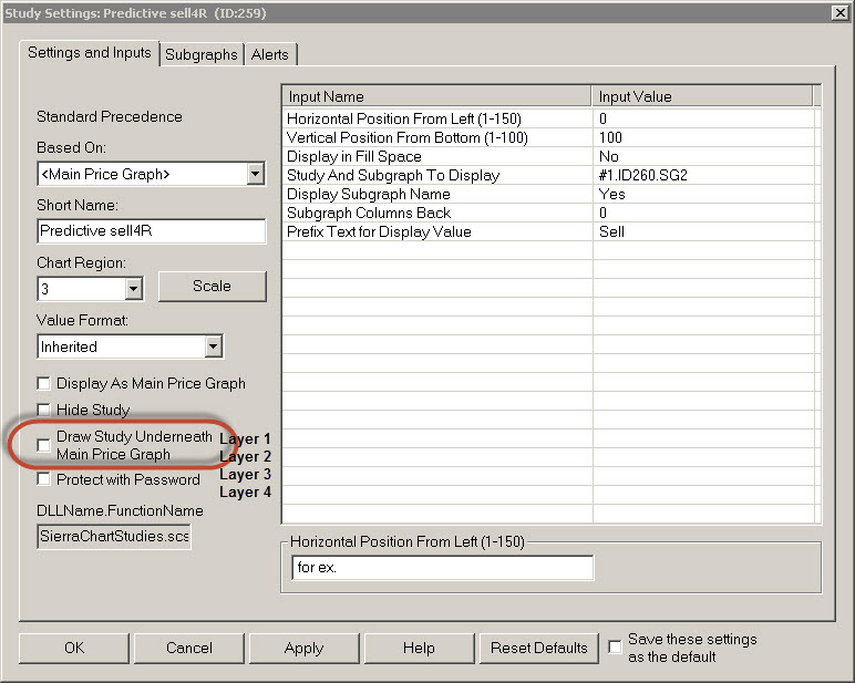 Hello, For the present conditions for each new study add we have the choice of only two positions in which layer it will be displayed :(Normal or "Draw Study Underneath Main Price Graph"). Sometimes I need to display in the front of the graphic a study defined very early in my Chart studies (for ex in position 11 because I use it in forcoming calculation). Nevertheless it need to be visible in my graphics ; For this I need to duplicate it at the end of my list of studies (for ex in position 180) to be sure I can see it on the graphic. Is it possible to have in SC the choice of at least 4 layers available (see my pic) ? It will be of great help for the accuracy in the display of studies without the need to juggle with their positioning in the list of studies. Thanks a lot for your comprehension http://www.sierrachart.com/image.php?l=1424172936208.png |
