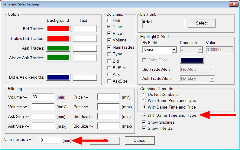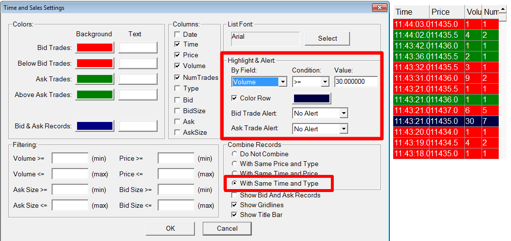 Today I'd like to come back concerning filter option "Num Trades". In the attached file so see 3 T&S. The left one without any filter, the middle one with the filter for volume and the rght one with the new filter "with same Time and Price" (many thanks for your fast implementation). May I call your attention now on the right T&S. Because of a lack of an additional filter (num trades as a minimum) you see all trades despite if the "Num Trades" = 1 or bigger. It would be much easier if you could filter additional with "Num Trades" >= "x" and if you could filter additional with Volume this would be the best solution. As an example I "customised" the T&S Settings in the second attached file. Many thanks |