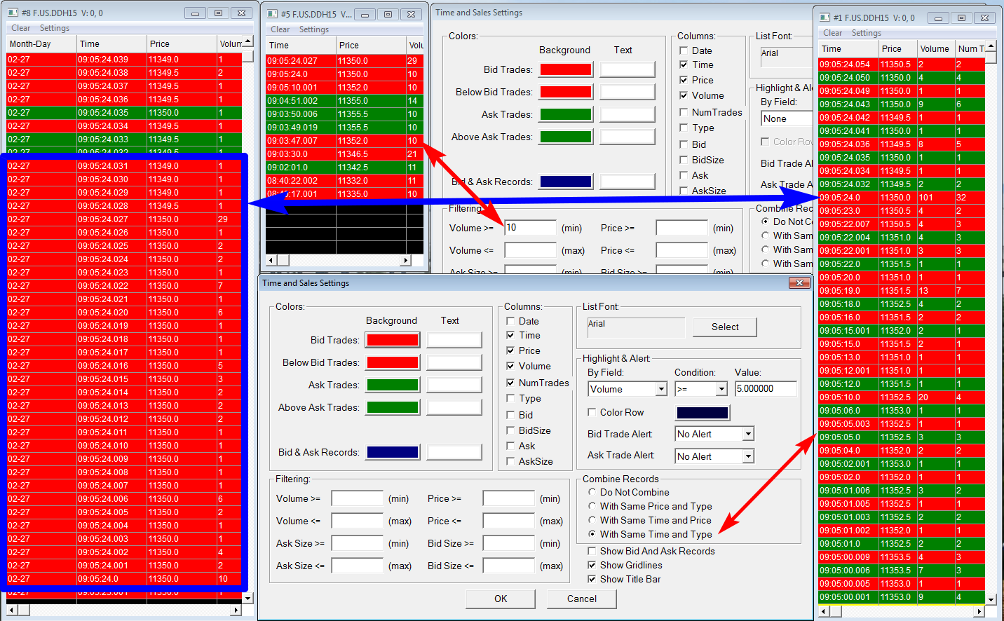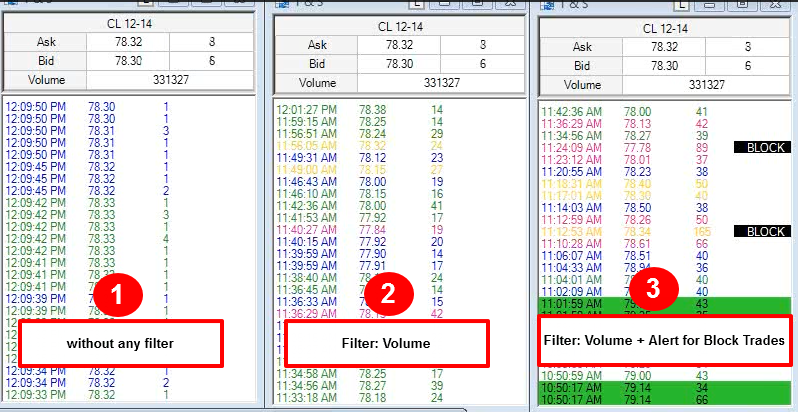I have the feeling we get stuck at the moment. In the attached file (example...) you can see three tapes (NT example) - No 1 without any filter - No 2 with Volume filter - No 3 with Volume filter + "Alert" for Block Trades No1 and No2 is possible with the T&S Settings. No 3 is - from my point of view - restricted in terms of clearness. There is a combine filter with "Same time and type" but it is hard to distinguish a bigger block trade from the other one (as you can see in the second attached file). Isn't it possible to improve the filter for block trades? Many thanks |