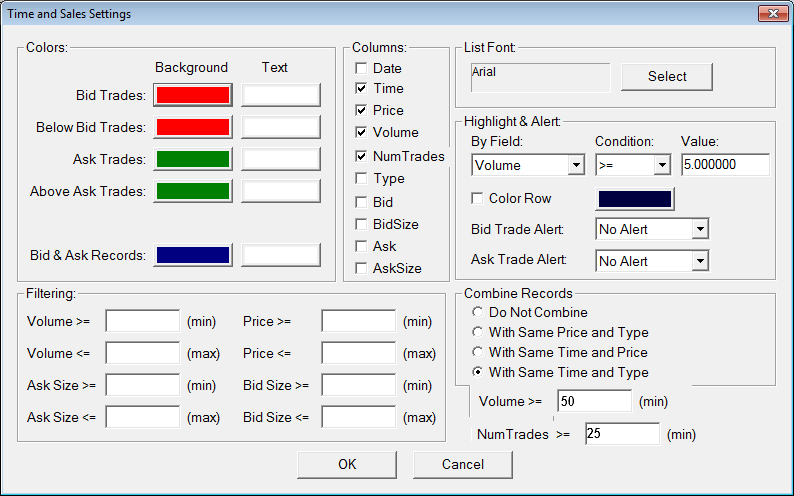 In the next release, we added the new combining option for time and type. The num trades filtering option does not make sense though, because filtering only takes place on input records not combined records, so the number of trades is always one.