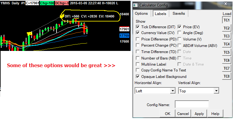 That is sooo close to perfect! However.... with the calculator tool I can see the ticks or points and I'm not seeing this option with the in the Chart Values Window. I use it to display the ticks versus always doing the math in my head. We are so close. Thanks for your help:) Date Time Of Last Edit: 2015-03-10 02:38:15