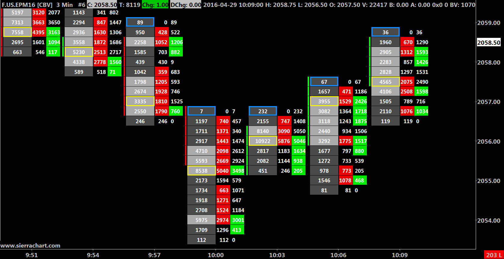 The best implementation of this in my opinion is Order Flow Analytics which is a set of tools written for Ninja Trader only. http://www.orderflowanalytics.com/english Here are some short videos explaining what they do: Cluster Concentration: http://player.vimeo.com/video/107437300/ Classification and Spreads: http://player.vimeo.com/video/107437301/ Show/Hide Levels: http://player.vimeo.com/video/107437302/ Being able to use Diagonal Dominant Side Coloring on text and then be able to independently show a background based on volume clusters - where the background shading is ONLY used on the clusters - makes reading orderflow on a rotational basis very clear and concise. Date Time Of Last Edit: 2015-03-09 17:22:52