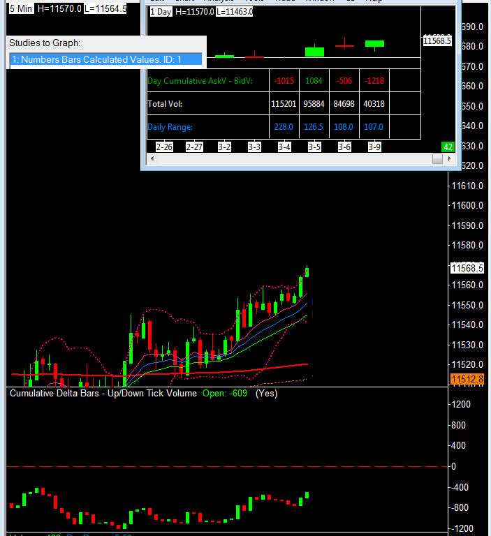 As you can see in the attached file there are two charts - M5 and D1. D1 chart contain "Numbers Bars Calculated Values" with focus on "Day cumulative AskV - BidV" = -1218 and M5 chart contain "Cumulative Delta Bars ..." with focus on sum = -609 Why do I have that difference. Shouldn't it be the same value? I am using an intraday data storage time unit of 1 tick Many thanks |