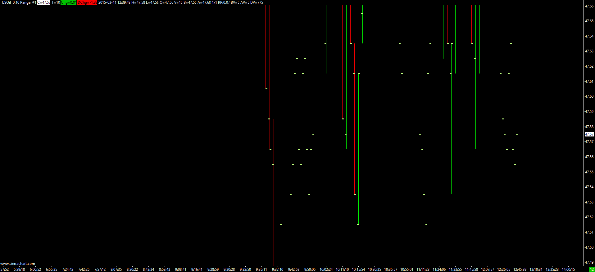I"m using the SC Forex Data (FXCM) [data] service. I have the intraday data storage time unit set to 1 tick. This example is for symbol USOil but my charts are doing this regardless of symbol. Global Settings : Price Display format - .01 Tick Size - 0.01 Currency Value Per Tick - .01 I have tried unchecking Overwrite Existing settings and then apply global symbol settings - this didn't change anything. Chart Settings : Price Display format - .01 Tick Size - 0.01 In the Edit>>Edit/Download Data - intraday data menu I see that the Last price level is showing .005 tick size am I missing something here? http://www.sierrachart.com/image.php?l=142609559331.png |
