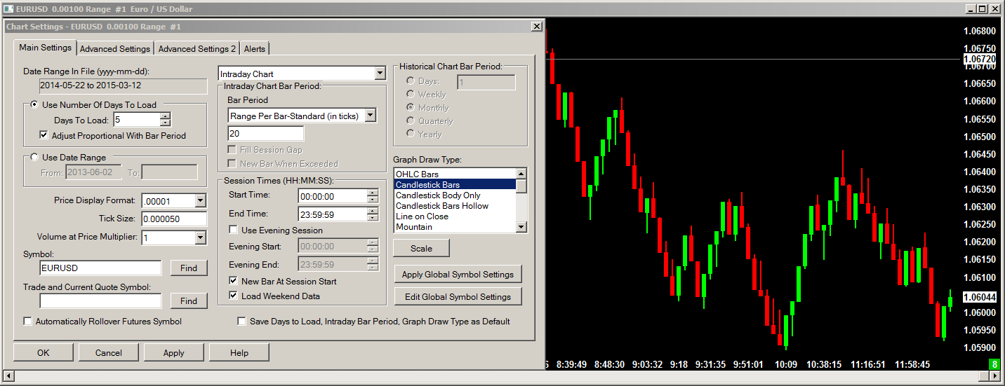 The 'Range Per Bar - Standard' is the most commonly use one. Go to Chart >> Chart Settings and note the Tick Size. Tick size is the same as pip size. For the EURUSD, 1.06500 to 1.06600 would be 20 pips if the Tick Size is 0.00005 |