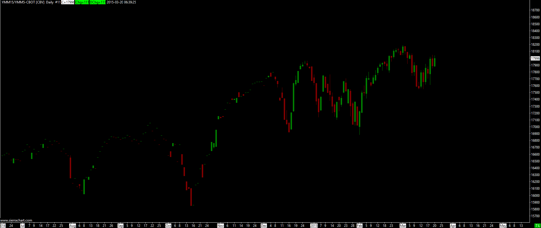 I recently changed my YM chart to the M contract month. The day chart is set to be continuous volume based rollover. Once it rolled over the continuous contract went away and will only display current month. On another PC I have the YM up with all the same settings and the chart displays the continuous contract as it should. |