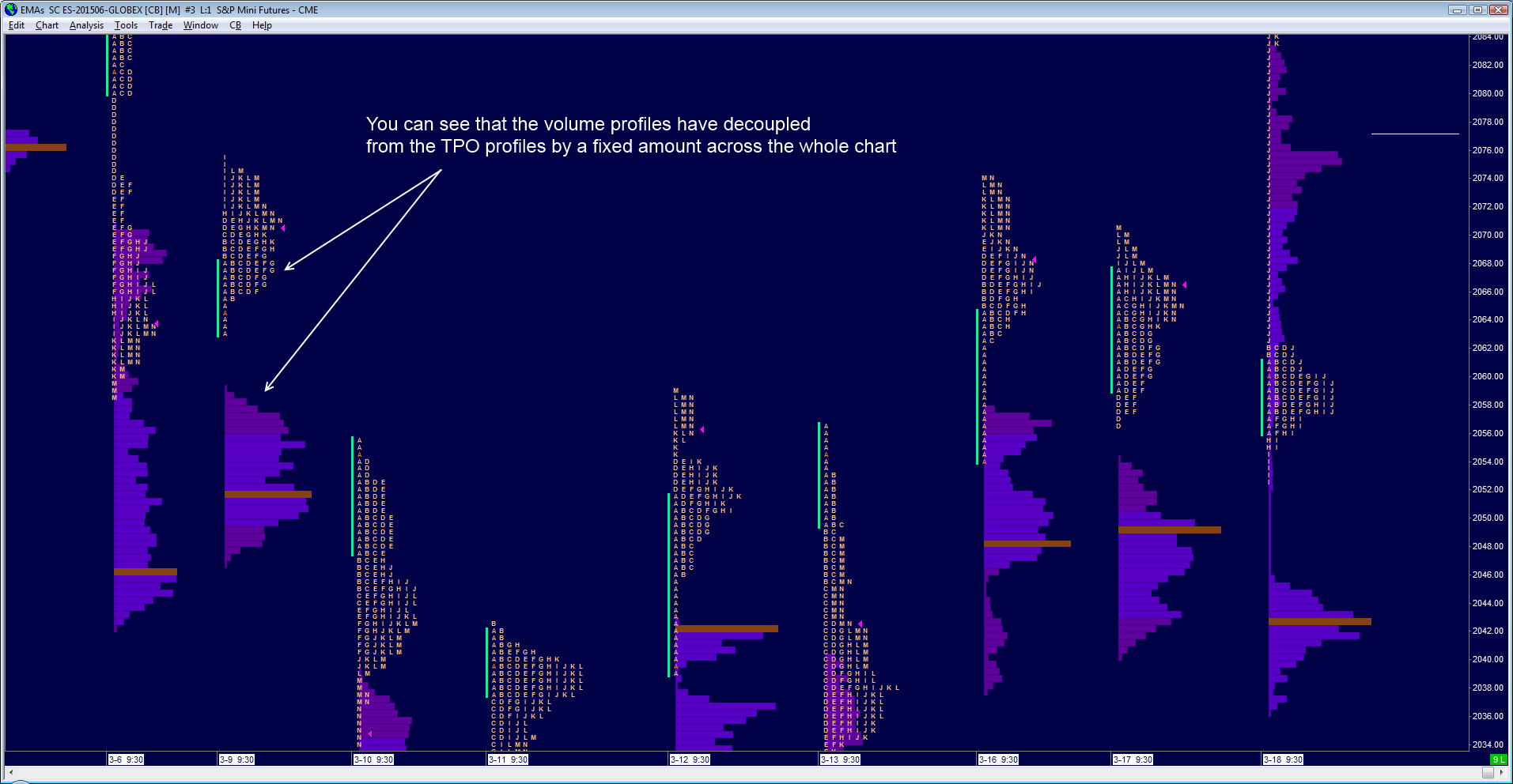 Hi SC. I've noticed this issue coming up for me for a long time. When I add a Volume by price study to a TPO chart and scroll the mousewheel up or down (regardless of the lock fill space setting) it has the effect of shifting all of the volume profiles vertically so that they are misaligned with the TPO profiles. I then have to left click the mouse a couple of times to get them to snap back into place again. The left clicking works irrespective of whether the mouse is set to a drawing tool, or the crosshair or the pointer etc. This happens every single time and appears far more pronounced on charts going back longer than about 5 days in total. It's a real head-scratcher. Can you replicate the problem? Many thanks, J |