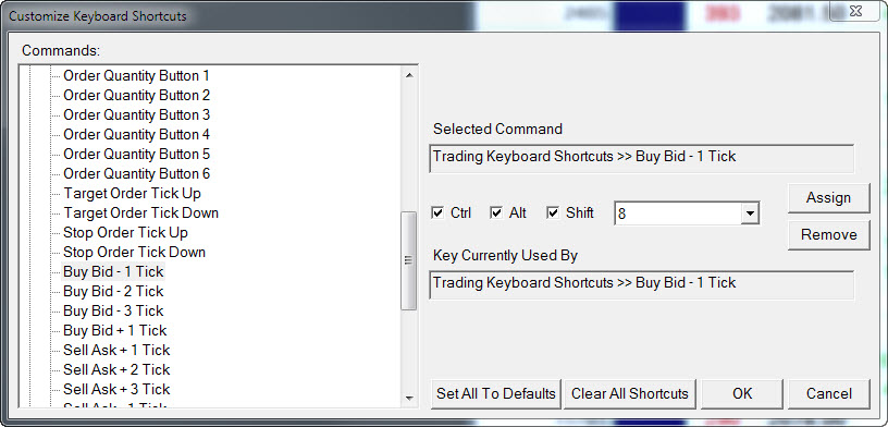 I am using SC Version 1242 I am programming Trading Keyboard Shortcuts for keyboard trading, I have "Trading Keyboard Shortcuts Enabled" checked on my Trade DOM. I am able to use shortcuts for the following commands: - buy/sell market - buy the bid - sell the ask - flatten The following commands shortcuts are not working, I used different combinations of ALT, CTL, SHFT, with numbers, letters, F-keys, numpad-keys, but all have failed to work: - reverse - cancel - moving the stop *) - moving the target *) - order quantity buttons - use attached orders - buy/sell bid/ask +/- n tick see attached image for an example of shortcut for "Buy Bid -1 Tick", which does not work. When I said they don't work, I mean when I pressed the shortcut keys programmed for these commands, with the DOM window receiving the active focus, nothing happened. I understand that some commands would only work when there are trade positions on the DOM, for example, "move target up 1 tick" requires that there is at least one long or short position on the DOM and there is one target order on the DOM, I have tested these commands under such appropriate conditions, those listed above as not working are all not working. Please help! Date Time Of Last Edit: 2015-03-30 20:16:48