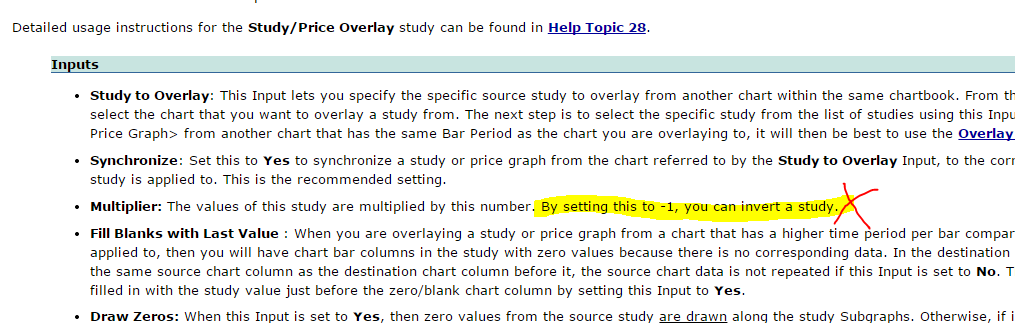 An alternative. Okay I think I have found a study that does the trick. It is Overlay - Line. Although the Study/Price Overlay description in the manual says Overlay - Line should only be used when the Source and Destination charts are the same bar type and period (which they are not in my case). However it seems to work. Does this seem correct ie that the Overylay - Line study will do the job I have outlined in the first post? I have noticed what I believe to be a mathematical error with how you describe the Multiplier parameter can be used in the Study/Price Overlay (and I assume by extension the Overlay - Line study) - see attached screen grab. You say that by using -1 (negative one) you can invert a price study. I think this is incorrect. To truly invert you need to divide by 1. Is it possible to fix this so it is a divisor and not a multiplier? Eg the Yen futures contract with the USD is quoted the inverse to what most media/data sources show it as. Right now the futures are about 0.8416 whereas most will quote it as 118.82. Now dividing .8416 by 1 only gets you 1.1882, but at least it is in the right format and we could play around with the realtime price multiplier on the futures feed to get the right answer. |