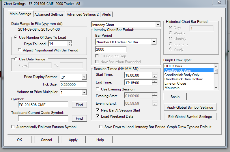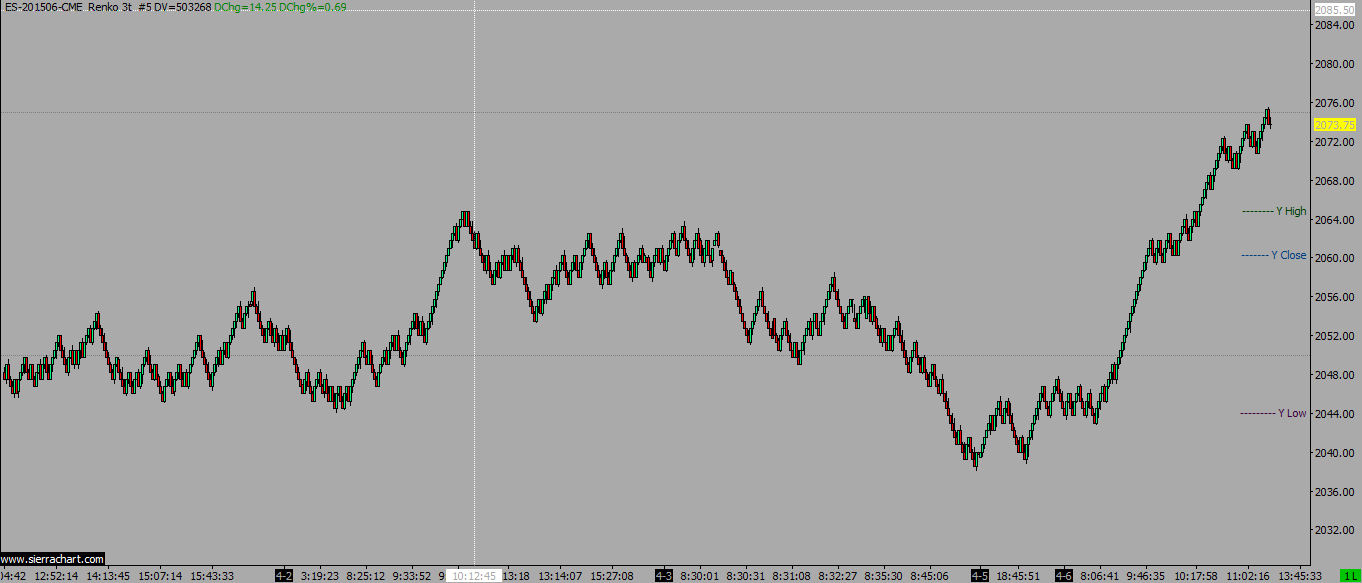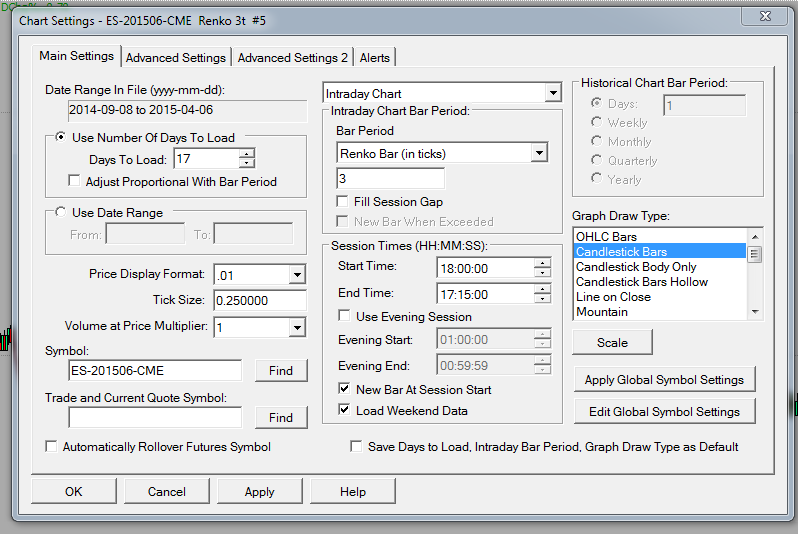I have the Period OHLC - Variable Period study on two different charts for the ES; a 2000 Trades chart and a 3 tick Renko chart. Friday's short day has caused an inconsistency with this study between the two charts. The 2000 Trades chart for today correctly shows the previous days H/L/C as being Friday 3 April (the short day). However the 3T Renko chart shows the previous day H/L/C as being from Thursday 2 April. Both charts have the same chart settings (apart from bar type) - see attached. Both instances of the study have the same configuration - see attached. So why does one chart (2000 Trades) give the correct answer and the other chart (3T Renko) is wrong - see attached charts? |