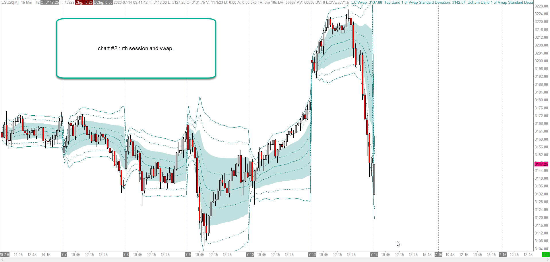 If I understand correctly, you want the regular vwap to appear on a globex session. If this is the case, you can try to do that we two charts. chart#1: globex or day session with day+evening session (for ex 18:00 - 17:00) chart#2: regular session (for ex 09:30 - 16:15) put a daily vwap on chart #2. overlay the chart#2 vwap on chart #1. be sure in the overlay to use: bar time containing match. I would also fill blanks with last value to yes. enclosed-by screenshots and chartbook. I used my ECIVwap, but you can do that with the native sierra vwap that works great and gives the same results for those vwaps. |