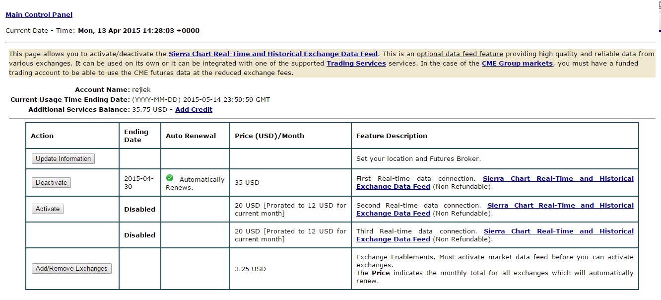 Do you have a futures trading account? If so, with what broker/trading service? For an understanding of why we ask this question, refer to this section here about CME data: http://www.sierrachart.com/index.php?page=doc/SierraChartRealTimeFuturesStockDataFeed.php#CME Sierra Chart Support - Engineering Level Your definitive source for support. Other responses are from users. Try to keep your questions brief and to the point. Be aware of support policy: https://www.sierrachart.com/index.php?l=PostingInformation.php#GeneralInformation For the most reliable, advanced, and zero cost futures order routing, *change* to the Teton service: Sierra Chart Teton Futures Order Routing |